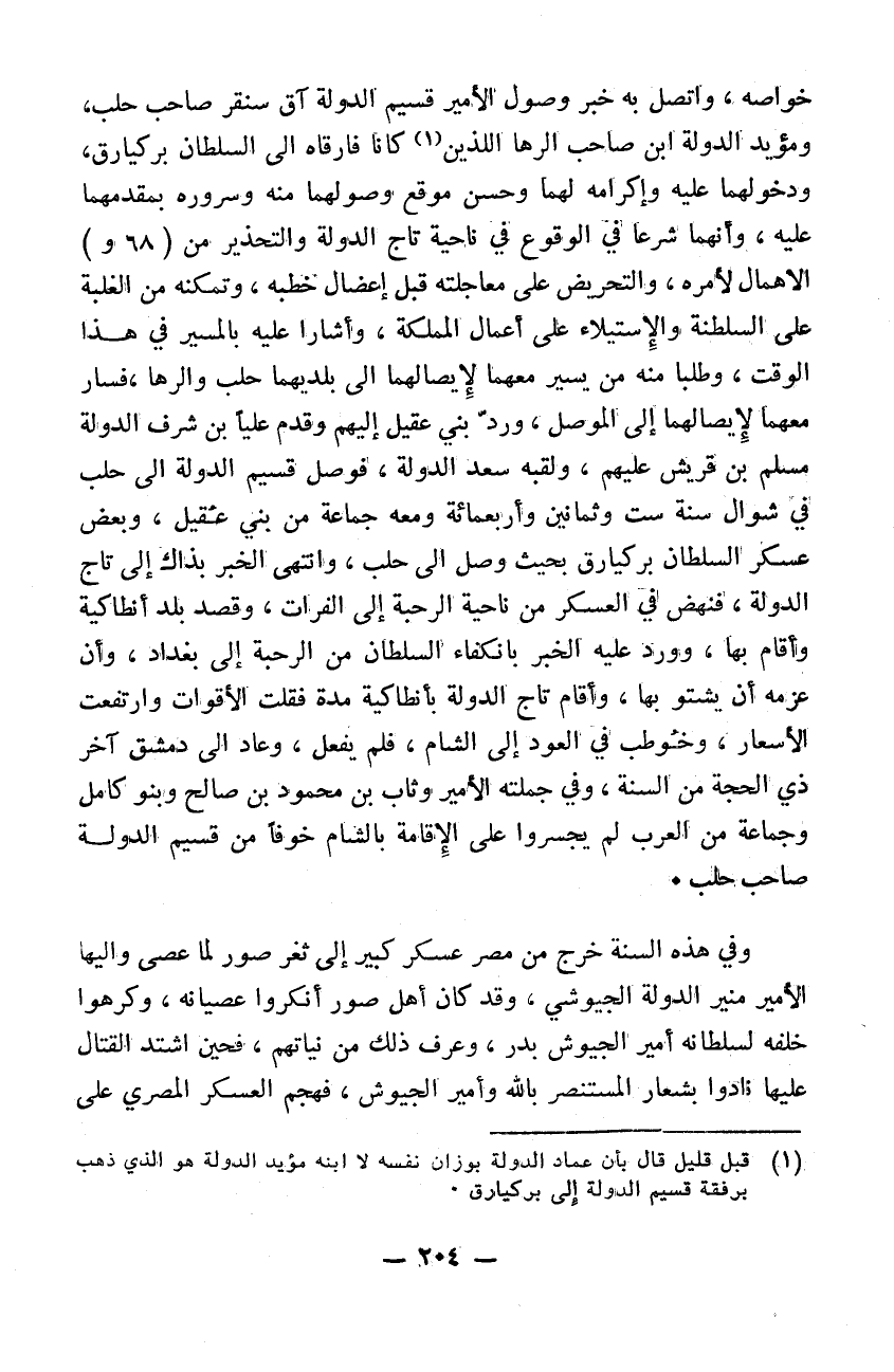 خواصه. واتصل به خبر وصول الأمير قسيم الدولة اق سنقر صاحب حلب ومويد الدولة صاحب الرها الذين كانا فارقاه إلى السلطان بركيارق ودخولهما عليه وإكرامه لهما وحسن موقع وصولهما منه وسروره بمقدمهما عليه وأنهما شرعا في وقوع في ناحية تاج الدولة والتحذير من الاهمال لأمره والتحريض على معاجلته قبل اعضال خطبه وتمكنه من الغلبة على السلطنة والاستيلاء على أعمال المملكة وأشارا عليه بالمسير في هذا الوقت وطلبا منه من يسير معهما لايصالهما إلى بلديهما حلب والرها فسار معهما لايصالهما إلى الموصل ورد بني عقيل إليهم وقدم علياً من شرف الدولة مسلم بن قريش عليهم ولقبه سعد الدولة. فوصل قسيم الدولة إلى حلب في شوال سنة 486 ومعه جماعة من بني عقيل وبعض عسكر السلطان بركيارق بحيث وصل إلى حلب وانتهى الخبر بذاك إلى تاج الدولة فنهض في العسكر من ناحية الرحبة إلى الفرات وقصد بلد أنطاكية وأقام بها وورد عليه الخبر بانكفاء السلطان من الرحبة إلى بغداد وأن عزمه أن يشتو بها وأقام تاج الدولة بأنطاكية مدة فقلت الأقوات وارتفعت الأسعار وخوطب في العود إلى الشام فلم يفعل وعاد إلى دمشق آخر ذي الحجة من السنة وفي جملته الأمير وثاب بن محمود بن صالح وبنو كامل وجماعة من العرب لم يجسروا على الاقامة بالشام خوفاً من قسيم الدولة صاحب حلب. وفي هذه السنة خرج من مصر عسكر كثير إلى ثغر صور لما عصى واليها الأمير منير الدولة الجيوشي وقد كان أهل صور أنكروا عصيانه وكرهوا خلفه لسلطانه أمير الجيوش بدر وعرف ذلك من نياتهم فحين اشتد القتال عليها نادوا بشعار المستنصر بالله وأمير الجيوش فهجم العسكر المصري على
