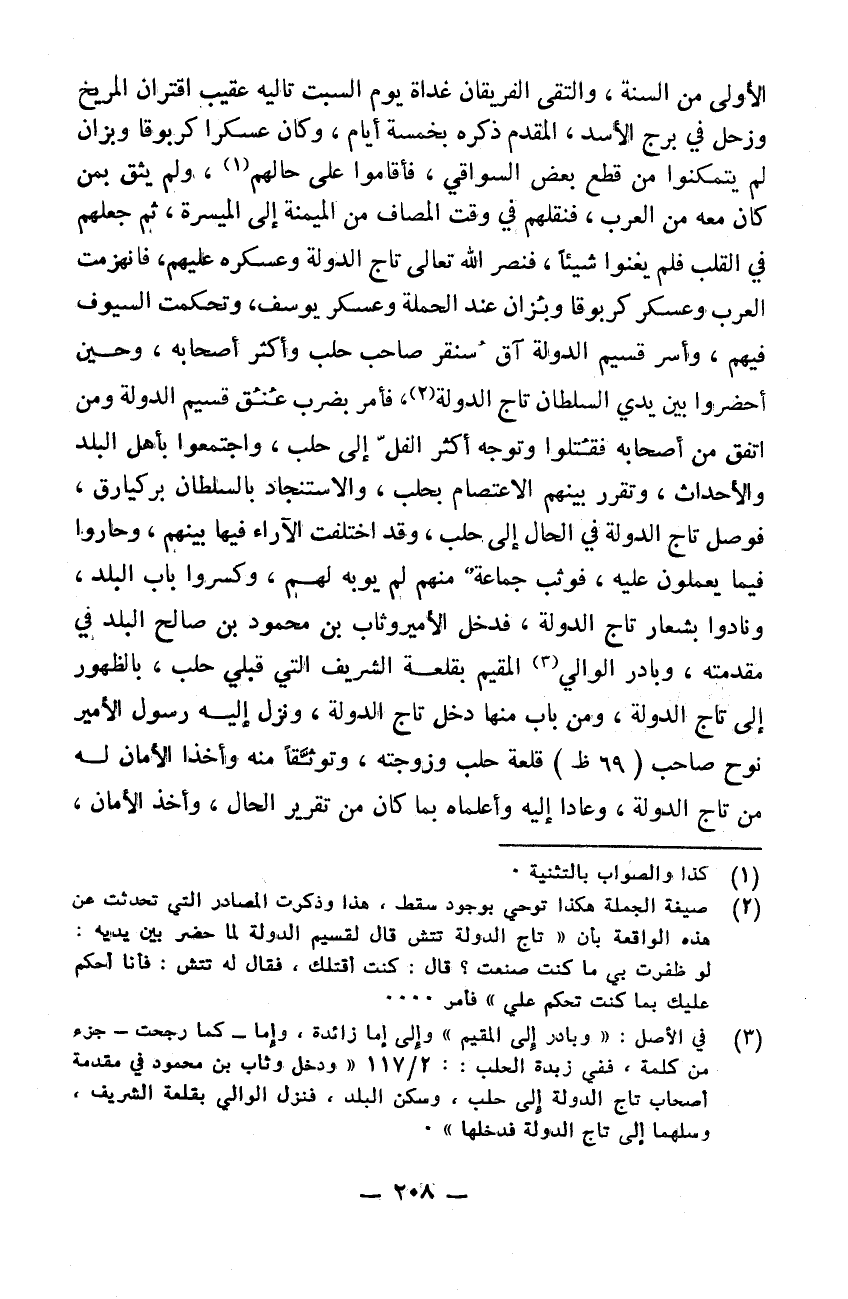 الأول من السنة والتقى الفريقان غداة يوم السبت تاليه عقيب اقتران المريخ وزحل في برج الأسد المقدم ذكره بخمسة أيام وكان عسكراً كربوقا وبوزان لم يتمكنوا من قطع بعض السواقي فأقاموا على حالهم ولم يثق بمن كان معه من العرب فنقلهم في وقت المصاف من الميمنة إلى الميسرة ثم جعلهم في القلب فلم يغنوا شيئاً فنصر الله تعالى تاج الدولة وعسكره عليهم فانهزمت العرب وعسكر كربوقا وبوزان عند الحملة وعسكر يوسف وتحكمت السيوف فيهم وأسر قسيم الدولة اق سنقر صاحب حلب وأكثر أصحابه وحين أحضروا بين يدي السلطان تاج الدولة فأمر بضرب عنق قسيم ومن اتفق من أصحابه فقتلوا وتوجه أكثر الفل إلى حلب واجتمعوا بأهل البلد والأحداث وتقرر بينهم الاعتصام بحلب والاستنجاد بالسلطان بركيارق. فوصل تاج الدولة في الحال إلى حلب وقد اختلفت الآراء فيها بينهم وحاروا فيما يعملون عليه فوثب جماعة منهم لم يوبه لهم وكسروا باب البلد ونادوا بشعار تاج الدولة فدخل الأمير وثاب بن محمود بن صالح البلد في مقدميه وبادر إلى المقيم بقلعة الشريف التي قبلي حلب بالظهور إلى تاج الدولة ومن باب منها دخل تاج الدولة ونزل إليه رسول الأمير نوح صاحب قلعة حلب وزوجته وتوثقا منه وأخذا الأمان له من تاج الدولة وعادا إليه وأعلماه بما كان من تقرير الحال وأخذ الأمان
