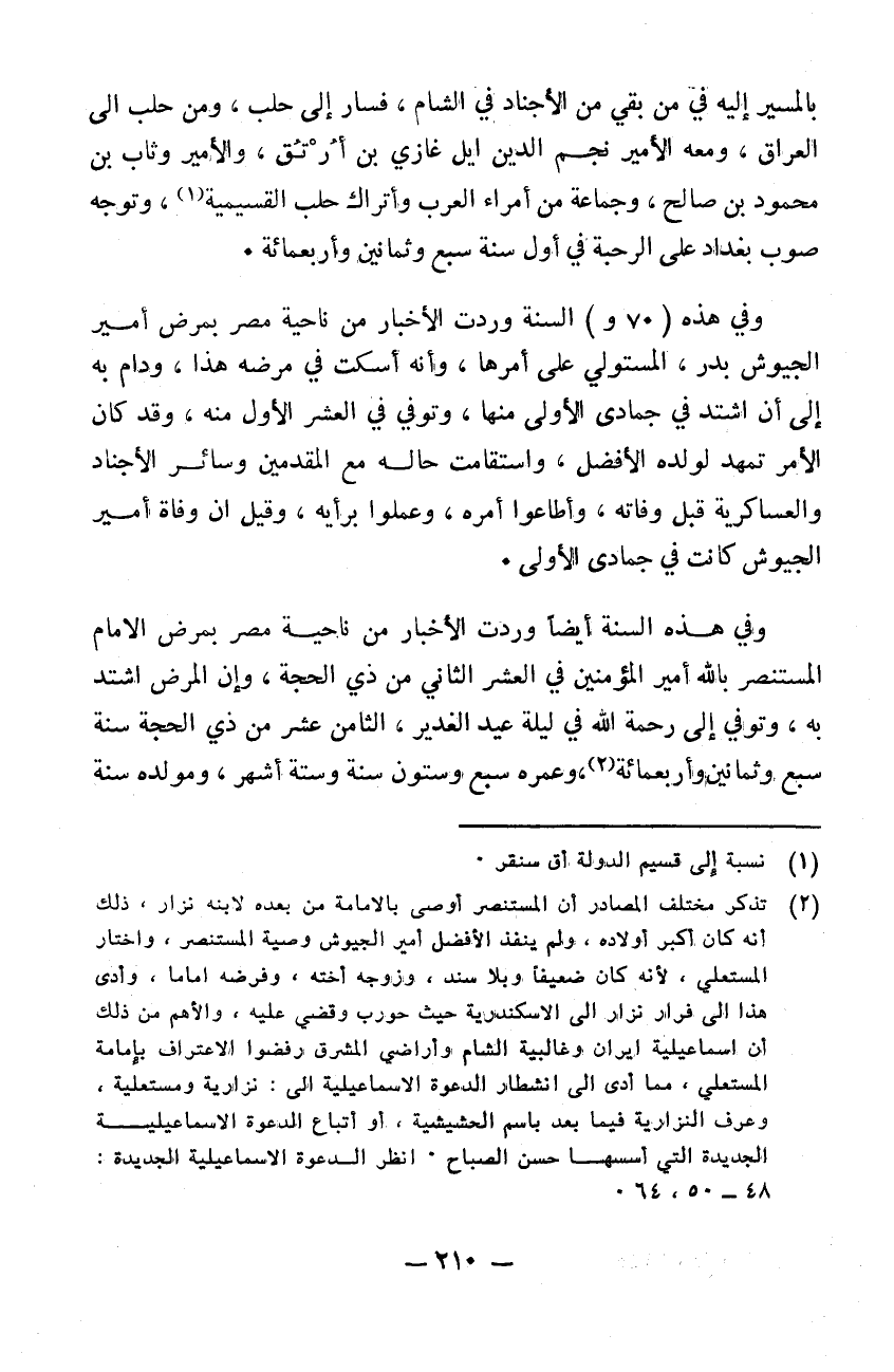 وفي هذه السنة وردت الأخبار من ناحية مصر بمرض أمير الجيوش بدر المستولي على أمرها وأنه أسكت في مرضه هذا ودام به إلى أن اشتد في جمادى الأولى منها وتوفي في العشر الأول منه وقد كان الأمر تمهد لولده الأفضل واستقامت حاله مع المقدمين وسائر الأجناد والعساكرية قبل وفاته وأطاعوا أمره وعملوا برأيه وقيل أن وفاة أمير الجيوش كانت في جمادى الأولى. وفي هذه السنة أيضاً وردت الأخبار من ناحية مصر بمرض الامام المستنصر بالله أمير المؤمنين في العشر الثاني من ذي الحجة وأن المرض اشتد به وتوفي إلى رحمة الله في ليلة عيد الغدير الثامن عشر من ذي الحجة سنة 487 وعمره سبع وستون سنة وستة أشهر ومولده سنة