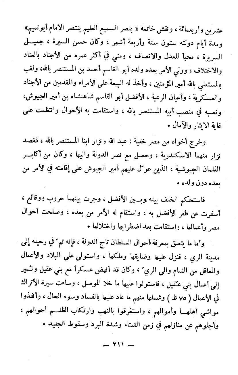 420 ونقش خاتمه بنصر السميع العليم ينتصر الامام أبو تميم ومدة أيام دولته ستون سنة وأربعة أشهر وكان حسن السيرة جميل السريرة محباً للعدل والانصاف ومني في أكثر عمره من الأجناد بالعناد والاختلاف وولي الأمر بعده ولده أبو القاسم أحمد بن المستنصر بالله ولقب بالمستعلي بالله أمير المؤمنين وأخذ له البيعة على الأمراء والمقدمين من الأجناد والعسكرية وأعيان الرعية الأفضل أبو القسم شاهنشاه بن أمير الجيوش ونصبه في منصب أبيه المستنصر بالله واستقامت به الأحوال وانتظمت على غاية الايثار والآمال. وخرج أخواه من مصر خفيةً عبد الله ونزار ابنا المستنصر بالله فقصد نزار منهما الاسكندرية وحصل مع نصر الدولة واليها وكان من أكابر الغلمان الجيوشية الذين عول عليهم أمير الجيوش على إقامته في الأمر من بعده دون ولده فاستحكم الخلف بينه وبين الأفضل وجرت بينهما حروب ووقايع أسفرت عن ظفر الأفضل به واستقام له الأمر من بعده وصلحت أحوال مصر وأعمالها واستقامت بعد اضطرابها واختلالها. وأما ما يتعلق بمعرفة أحوال السلطان تاج الدولة فإنه تم في رحيله إلى مدينة الري فنزل عليها وضايقها وملكها واستولى على البلاد والأعمال والمعاقل من الشام وإلى الري وكان قد أنهض عسكراً مع بني عقيل ونمير إلى أعمال بني عقيل فاستولوا عليها ما خلا الموصل وساءت سيرة الأتراك في الأعمال وشملها منهم ما عاد عليها بالفساد وسوء الحال وانفدوا مواشي أهلها وأموالهم واستغرقوا بالنهب وارتكاب الظلم أحوالهم وأجلوهم عن منازلهم في زمن الشتاء وشدة البرد وسقوط الثلج والجليد.