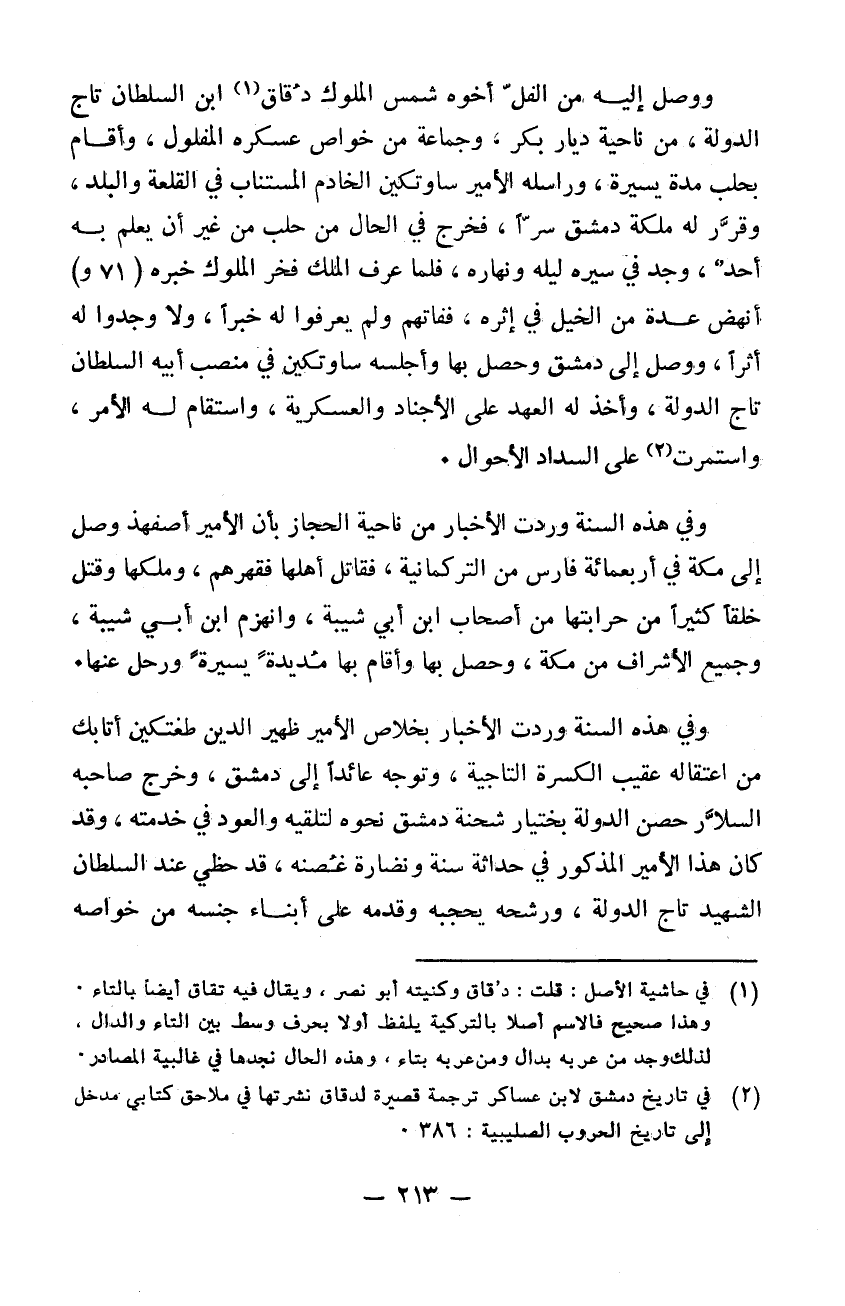 ووصل إليه من الفل أخوه شمس الملوك دقاق ابن السلطان تاج الدولة من ناحية دياربكر وجماعة من خواص عسكره المفلول وأقام بحلب مدة يسيرة وراسله الأمير ساوتكين الخادم المستناب في القلعة والبلد وقرر له ملكة دمشق سراً فخرج في الحال من حلب من غير أن يعلم به أحد وجد في سيره ليله ونهاره فلما عرف الملك فخر الملوك خبره أنهض عدة من الخيل في أثره ففاتهم ولم يعرفوا له خبراً ولا وجدوا له أثراً ووصل إلى دمشق وحصل بها وأجلسه ساوتكين في منصب أبيه السلطان تاج الدولة وأخذ له العهد على الأجناد والعسكرية واستقام له الأمر واستمرت على السداد الأحوال. وفي هذه السنة وردت الأخبار من ناحية الحجاز بأن الأمير اصفهبذ وصل إلى مكة في أربعمائة فارس من التركمانية فقاتل أهلها فقهرهم وملكها وقتل خلقاً كثيراً من حرابتها من أصحاب ابن أبي شيبة وانهزم ابن أبي شيبة وجمع الأشراف من مكة وحصل بها وأقام بها مديدةً يسيرةً ورحل عنها