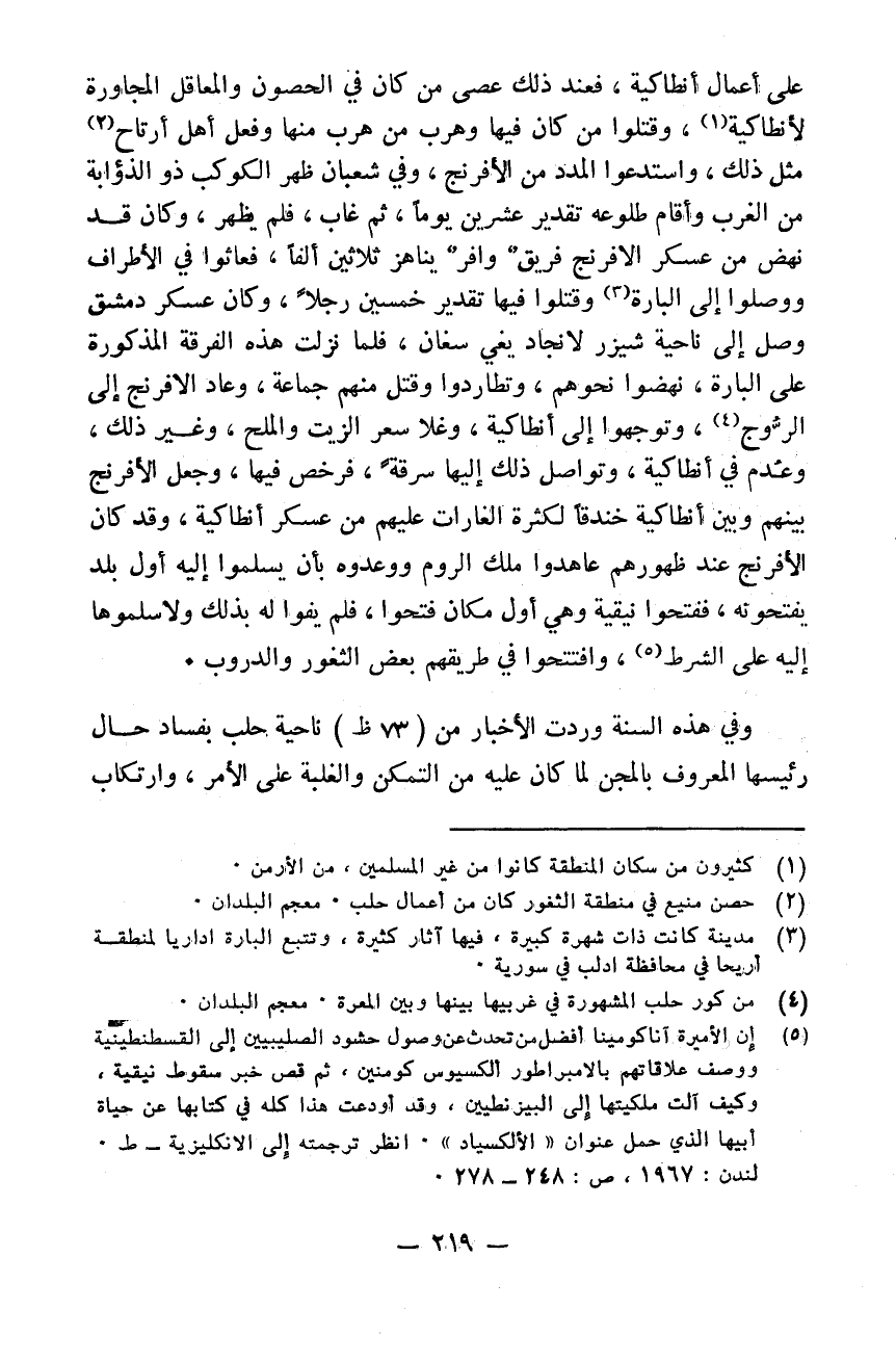 على أعمال أنطاكية فعند ذلك عصى من كان في الحصون المعاقل المجاروة لأنطاكية وقتلوا من كان فيها وهرب من هرب منها وفعل أهل ارتاح مثل ذلك واستدعوا المدد من الافرنج. وفي شعبان ظهر الكوكب ذو الذؤابة من الغرب وأقام طلوعه تقدير عشرين يوماً ثم غاب فلم يظهر وكان قد نهض من عسكر الافرنج فريق وافر يناهز ثلاثين ألفاً فعاثوا في الأطراف ووصلوا إلى البارة وفتكوا فيها تقدير خمسين رجلاً وكان عسكر دمشق وصل إلى ناحية شيزر لانجاد ياغي سيان فلما نزلت هذه الفرقة المذكورة على البارة ونهضوا نحوهم وتطاردوا وقتل منهم جماعة وعاد الافرنج إلى الروج وتوجهوا إلى أنطاكية. وغلا سعر الزيت والملح وغير ذلك وعدم في أنطاكية وتواصل ذلك إليها سرقةً فرخص فيها وجعل الافرنج بينهم وبين أنطاكية خندقاً لكثرة الغارات عليهم من عسكر أنطاكية وقد كان الافرنج عند ظهورهم عاهدوا ملك الروم ووعدوه بأن يسلموا إليه أول بلد يفتحونه ففتحوا نيقية وهي أول مكان فتحوه فلم يفوا له بذلك ولا سلموها إليه على الشرط وافتتحوا في طريقهم بعد الثغور والدروب. وفي هذه السنة وردت الأخبار من ناحية حلب بفساد حال رئيسها المعروف بالمجن لما كان عليه من التمكن والغلبة على الأمر وارتكاب