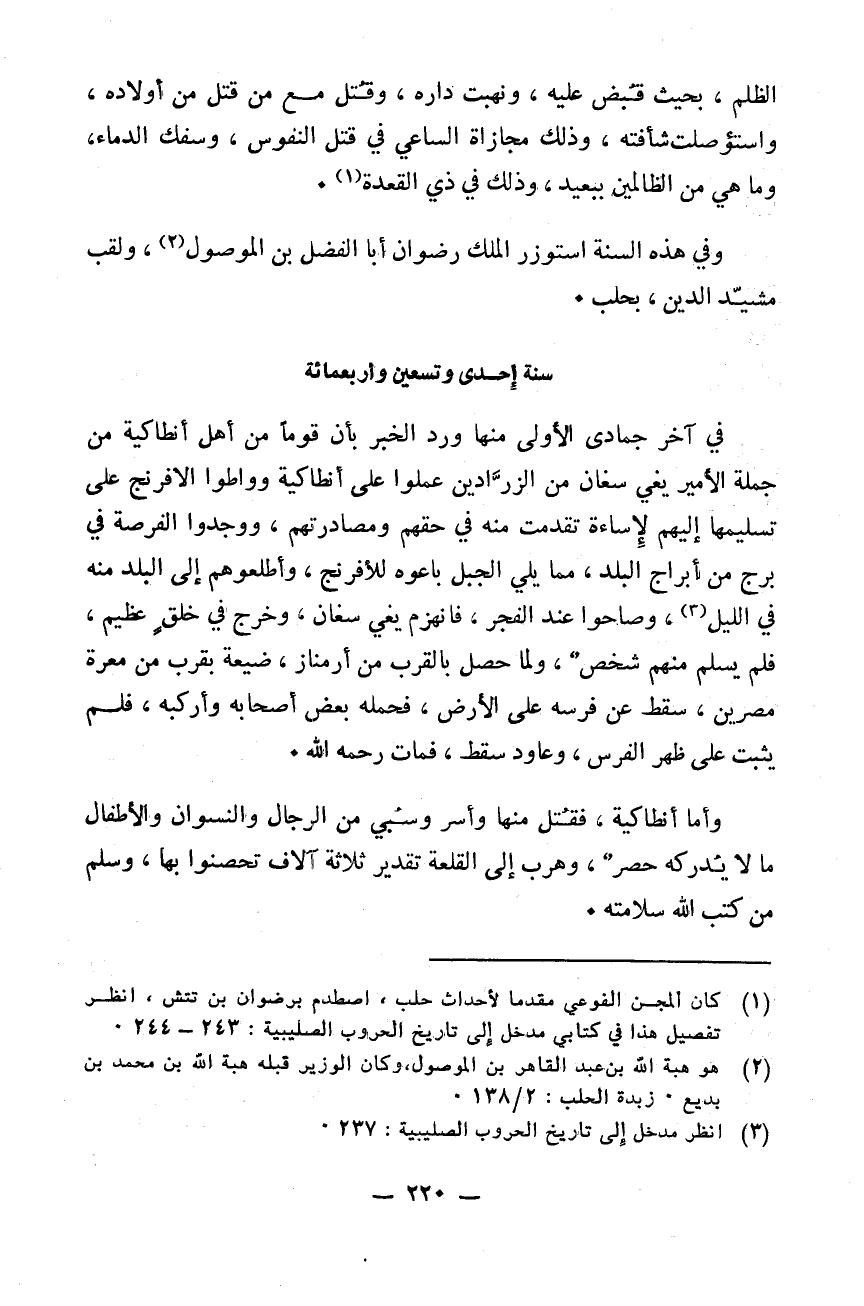 الظلم بحيث قبض عليه ونهبت داره وقتل مع من قتل من أولاده واستؤصلت شأفته وذلك مجازاة الساعي في قتل النفوس وسفك الدماء وما هي من الظالمين ببعيد وذلك في ذي القعدة. وفي هذه السنة استوزر الملك رضوان أبا الفضل بن الموصول ولقب مشيد الدين بحلب