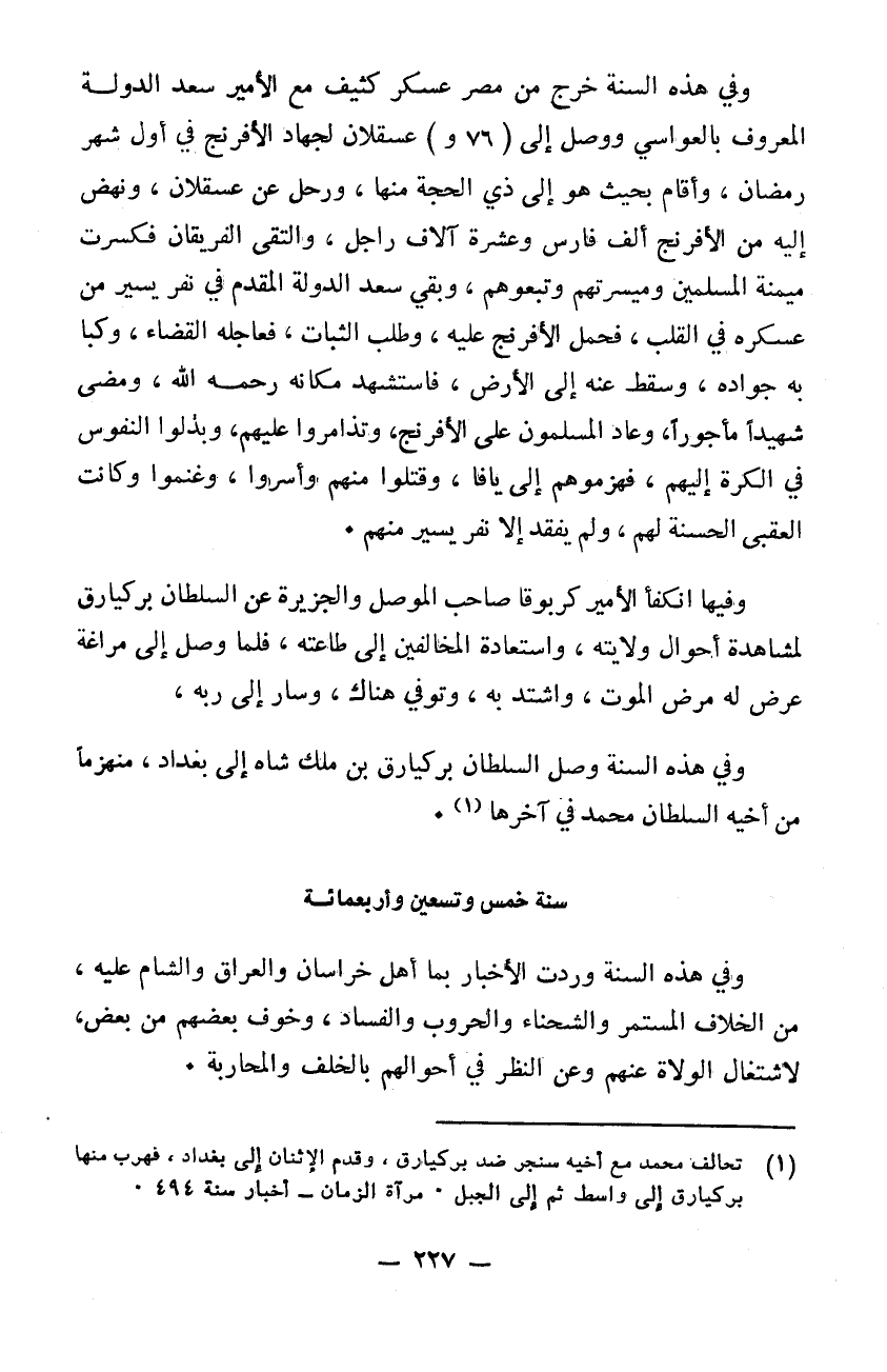 وفي هذه السنة خرج من مصر عسكر كثيف مع الأمير سعد الدولة المعروف بالقوامسي ووصل إلى عسقلان لجهاد الافرنج في أول شهر رمضان وأقام بحيث هو إلى ذي الحجة منها ورحل عن عسقلان ونهض إليه من الافرنج ألف فارس وعشرة آلاف راجل والتقى الفريقان فكسرت ميمنة المسلمين وميسرتهم وتبعوهم وبقي سعد الدولة المقدم في نفر يسير من عسكره في القلب فحمل الافرنج عليه وطلب الثبات فعاجله القضاء وكبا به جواده وسقط عنه إلى الأرض فاستشهد مكانه رحمه الله ومضى شهيداً مأجوراً. وعاد المسلمون على الافرنج وتذامروا عليهم وبذلوا النفوس في الكرة إليهم فهزموهم إلى يافا وقتلوا منهم وأسروا وغنموا وكانت العقبى الحسنة لهم ولم يفقد إلا نفر يسير منهم. وفيها انكفا الأمير كربوقا صاحب الموصل والجزيرة عن السلطان بركيارق لمشاهدة أحوال ولايته واستعادة المخالفين إلى طاعته فلما وصل إلى مراغة عرض له مرض الموت واشتد به وتوفي هناك وسار إلى ربه. وفي هذه السنة وصل السلطان بركيارق بن ملك شاه إلى بغداد منهزماً من أخيه السلطان محمد في أخرها