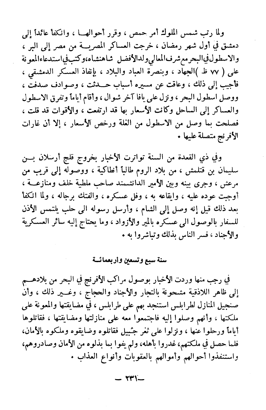 ولما رتب شمس الملوك أمر حمص وقرر أحوالها وانكفأ عائداً إلى دمشق في أول شهر رمضان خرجت العساكر المصرية من مصر إلى البر والاصطول في البحر مع شرف ولد الأفضل شاهنشاه وكتب في استدعاء المعونة على الجهاد وبنصرة العباد والبلاد بانفاذ العسكر الدمشقي فأجيب إلى ذلك وعاقت عن مسيره أسباب حدثت وصوادف صدفت ووصل أصطول البحر ونزل على يافا آخر شوال وأقام أياماً وتفرق الاصطول والعساكر إلى الساحل وكانت الأسعار بها قد ارتفعت والأقوات قد قلت فصلحت بما وصل مع الاصطول من الغلة ورخص الأسعار إلا أن غارات الافرنج متصلة عليها وفي ذي القعدة من السنة تواترت الأخبار بخروج قلج أرسلان بن سليمان بن قتلمش من بلاد الروم طالباً أنطاكية ووصوله إلى قريب من مرعش وجرى بينه وبين الأمير الدانشمند صاحب ملطية خلف ومنازعة أوجبت عوده عليه وإيقاعه به وفل عسكره والفتك برجاله ولما انكفأ بعد ذلك قيل أنه وصل إلى الشام وأرسل رسوله إلى حلب يلتمس الاذن للسفار بالوصول إلى عسكره بالمير والازواد وما يحتاج إليه سائر العسكرية والاجناد فسر الناس بذلك وتباشروا به