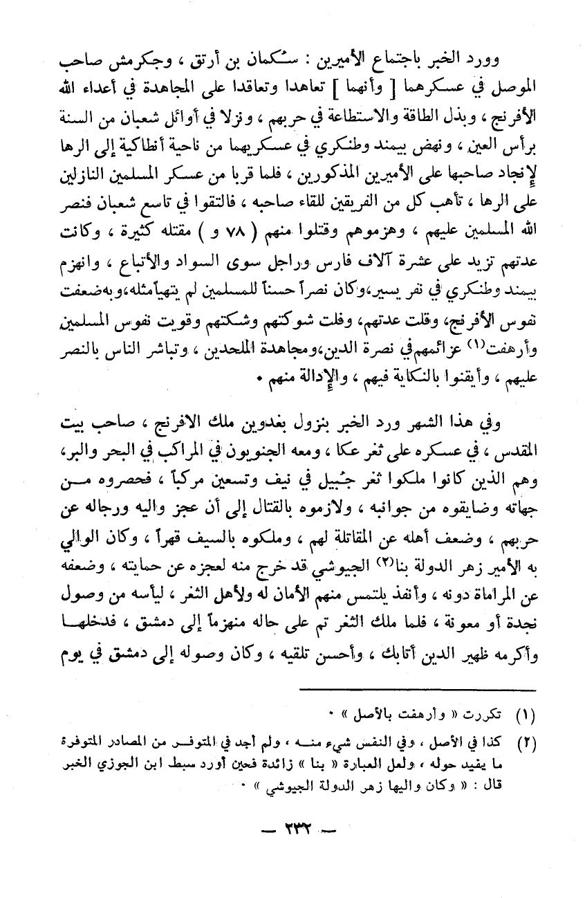 وورد الخبر باجتماع الأميرين سكمان بن أرتق وجكرمش صاحب الموصل في عسكرهما وتعاهدا وتعاقدا على المجاهدة في أعداء الله الافرنج وبذل الطاعة والاستطاعة في حربهم ونزلا في أوائل شعبان من السنة برأس العين. ونهض بيمند وطنكري في عكسريهما من ناحية أنطاكية إلى الرها لانجاد صاحبها على الأميرين المذكورين فلما قربا من عسكر المسلمين النازلين على الرها تأهب كل من الفريقين للقاء صاحبه فالتقوا في تاسع شعبان فنصر الله المسلمين عليهم وعزموهم وقتلوا منهم مقتلة كثيرة وكانت عدتهم تزيد على عشرة آلاف فارس وراجل سوى السواد والاتباع وانهزم بيمند وطنكري في نفر يسير وكان نصراً حسناً للمسلمين لم يتهيأ مثله وبه ضعفت نفوس الافرنج وقلت عدتهم وفلت شوكتهم وشكتهم وقويت نفوس المسلمين وأرهنت وأرهفت عزائمهم في نصرة الدين ومجاهدة الملحدين وتباشر الناس بالنصر عليهم وأيقنوا بالنكاية فيهم والادالة منهم