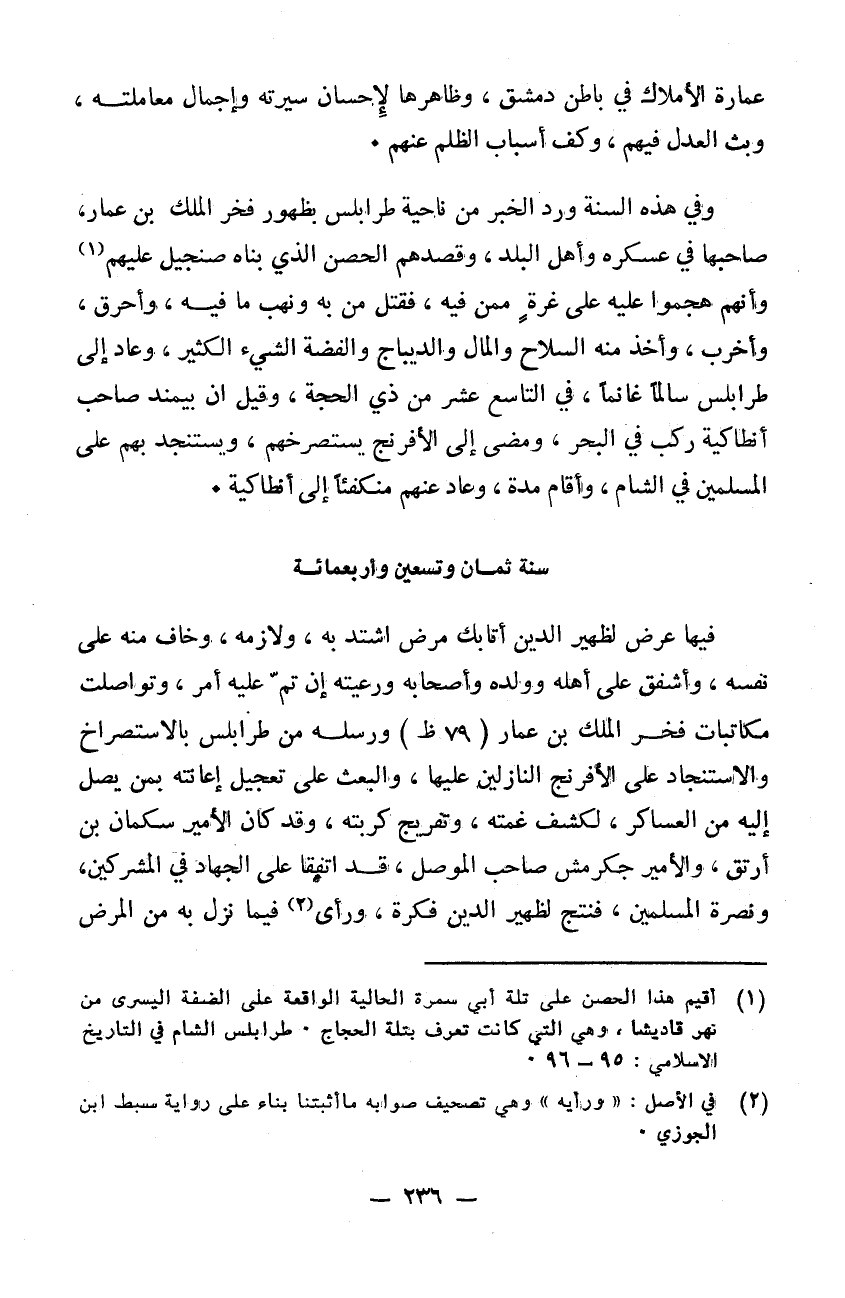 فيها عرض لظهير الدين أتابك مرض اشتد به ولازمه وخاف منه على نفسه وأشفق على أهله وولده وأصحابه ورعيته إن تم عليه أمر وتواصلت مكاتبات فخر الملك بن عمار ورسله من طرابلس بالاستصراخ والاستنجاد على الافرنج النازلين عليها والبعث على تعجيل إعانته بمن يصل إليه من العساكر لكشف غمته وتفريج كربته وقد كان الأمير سكمان بن ارتق والأمير جكرمش صاحب الموصل قد اتفقا على الجهاد في المشركين ونصرة المسلمين فنتج لظهير الدين فكرة وراية فيما نزل به من المرض