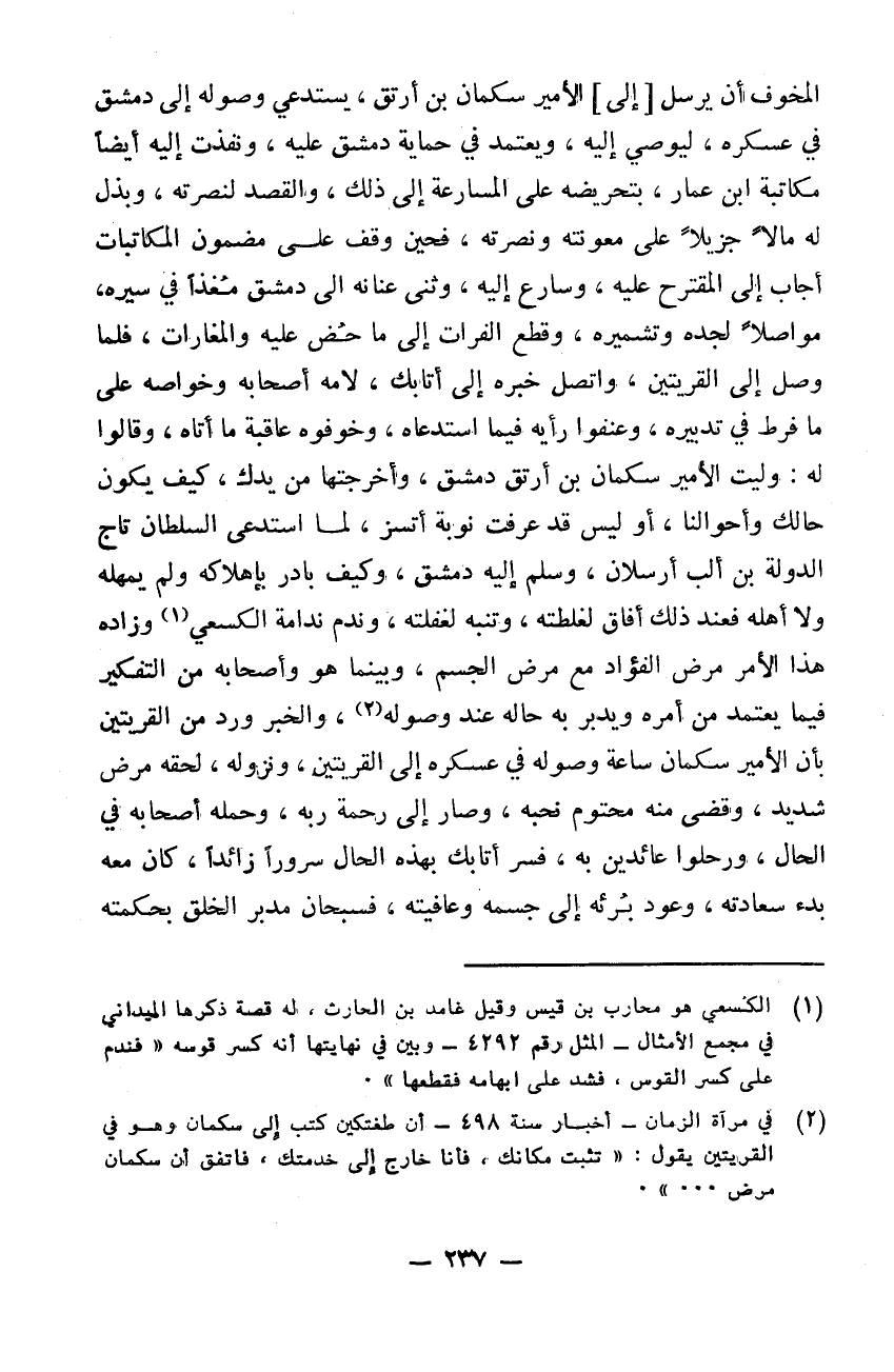 المخوف أن يرسل الأمير سكمان بن ارتق يستدعي وصوله إلى دمشق في عسكره ليوصي إليه ويعتمد في حماية دمشق عليه. ونفذت إليه أيضاً مكاتبة ابن عمار بتحريضه على المسارعة إلى ذلك والقصد لنصرته وبذل له مالاً جزيلاً على معونته ونصرته فحين واقف على مضمون المكاتبات أجاب إلى المقترح عليه وسارع إليه وثنى عنانه إلى دمشق مغذاً في سيره مواصلاً لجدة نجده وتشميره وقطع الفرات إلى ما حض عليه والمغارات. فلما وصل إلى القريتين واتصل خبره إلى أتابك لامه أصحابه وخواصه على ما فرط في تدبيره وعنفوا رأيه فيما استدعاه وخوفوه عاقبة ما أتاه وقالوا له: إذا وصلت الأمير سكمان بن ارتق دمشق وأخرجتها من يدك كيف يكون حالك وأحوالنا أو ليس قد عرفت نوبة اتسز لما استدعى السلطان تاج الدولة بن البارسلان وسلم إليه دمشق كيف بادر باهلاكه ولم يمهله ولا أهله. فعند ذلك أفاق لغلطته وتنبه لغفلته وندم ندامة الكسعي وزاده هذا الأمر مرض الفؤاد مع مرض الجسم. وبينما هو وأصحابه من التفكر فيما يعتمد من أمره وتدبير به حاله عند وصوله والخبر ورد من القريتين بأن الأمير سكمان ساعة وصوله في عسكره إلى القريتين ونزوله لحقه مرض شديد وقضى منه محتوم نحبه وصار إلى رحمة ربه وحمله أصحابه في الحال ورحلوا عائدين به فسر أتابك بهذه الحال سروراً زائداً كان معه بدء سعادته وعود برئه إلى جسمه وعافيته فسبحان مدبر الخلق بحكمته