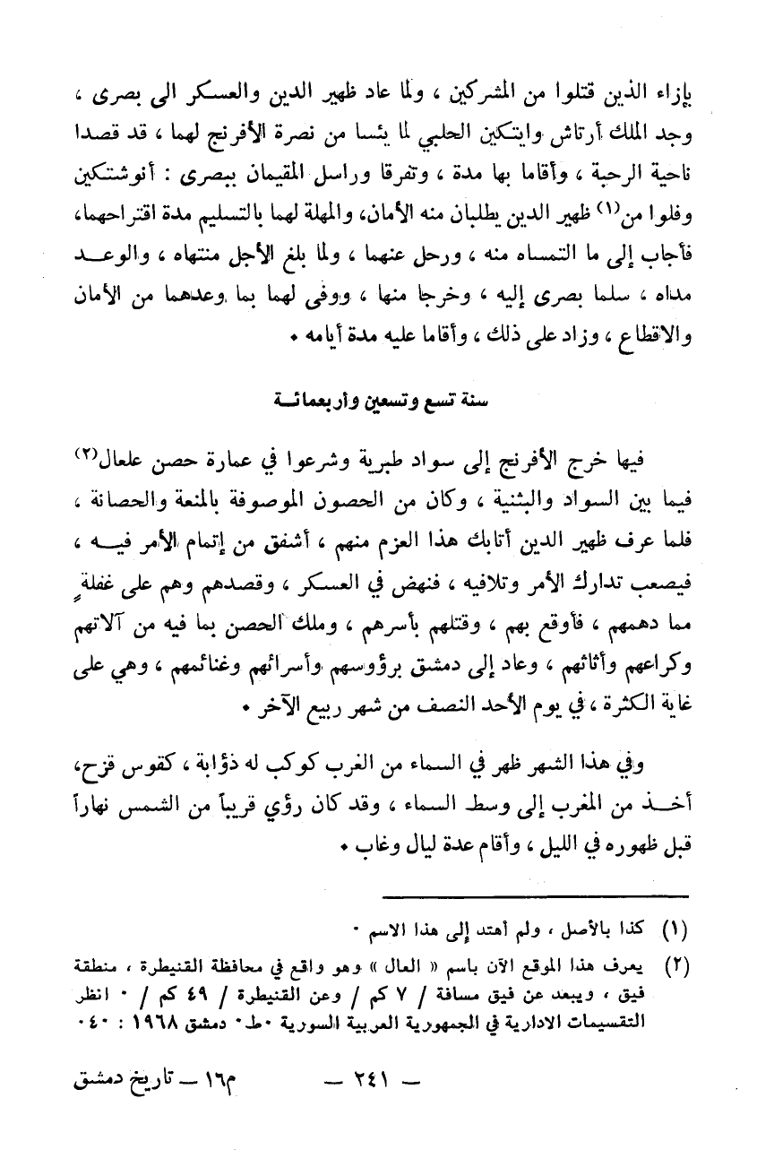 فيها خرج الافرنج إلى سواد طبرية وشرعوا في عمارة حصن علعال فيما بين السواد والبثنية وكان من الحصون الموصوفة بالمنعة والحصانة فلما عرف ظهير الدين أتابك هذا العزم منهم لشفق من اتمام الأمر فيه فيصعب تدارك الأمر وتلافيه فنهض في العسكر وقصدهم وهو على غفلة مما دهمهم فأوقع بهم وقتلهم بأسرهم وملك الحصن بما فيه من آلاتهم وكراعهم وأثاثهم وعاد إلى دمشق برؤوسهم وأسرائهم وغنائمهم وهي على غاية الكثرة في يوم الأحد النصف من شهر ربيع الآخر. وفي هذا الشهر ظهر في السماء من الغرب كوكب له ذوابة كقوس قزح أخذه من المغرب إلى وسط السماء وقد كان رؤي قريباً من الشمس نهاراً قبل ظهوره في الليل وأقام عدة ليال وغاب