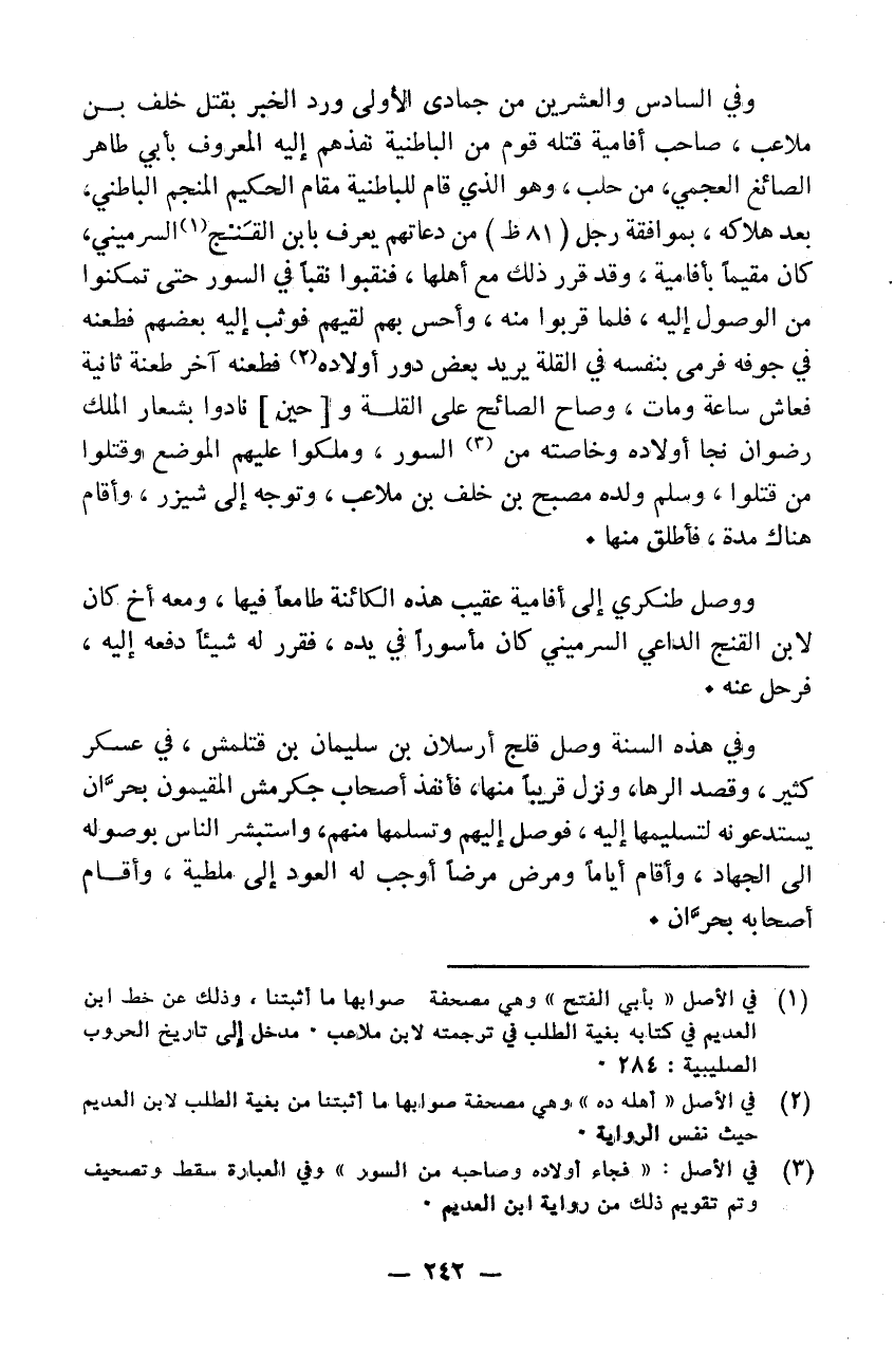 وفي السادس والعشرين من جمادى الأولى ورد الخبر بقتل خلف بن ملاعب صاحب أفامية قتله قوم من الباطنية نفذهم إليه المعروف بأبي طاهر الصائغ العجمي من حلب وهو الذي قام للباطنية مقام الحكيم المنجم الباطني بعد هلاكه بموافقة رجل من دعاتهم يعرف بأبي الفتح السرميني كان مقيماً بأفامية وقد قرر ذلك مع أهلها فنقبوا نقباً في السور حتى تمكنوا من الوصول إليه فلما قربوا منه وأحس بهم لقيهم فوثب إليه بعضهم فطعنه في جوفه فرمى بنفسه في القلة يريد بعض دور أهله ده كذا فطعنه آخر طعنةً ثانيةً فعاش ساعة ومات وصاح الصائح على القلة ونادوا بشعار الملك رضوان فجاء أولاده وصاحبه من السور وملكوا عليهم الموضع وقتلوا من قتلوا وسلم ولده مصبح بن خلف بن ملاعب وتوجه إلى شيزر وأقام هناك مدة فاطلق منها. ووصل طنكري إلى أفامية عقيب هذه الكائنة طامعاً فيها ومعه أخ كان لأبي الفتح الداعي السرميني كانوا مأسوراً في يده فقرر له شيئاً دفعه إليه فرحل عنه وفي هذه السنة وصل قلج أرسلان بن سليمان بن قتلمش في عسكر كثير وقصد الرها ونزل قريباً منها فأنفذ أصحاب جكرمش المقيمون بحران يستدعونه لتسليمها إليه فوصل إليهم وتسلمها منهم واستبشر الناس بوصوله إلى الجهاد وأقام أياماً ومرض مرضاً أوجب له العود إلى ملطية وأقام أصحابه بحران.