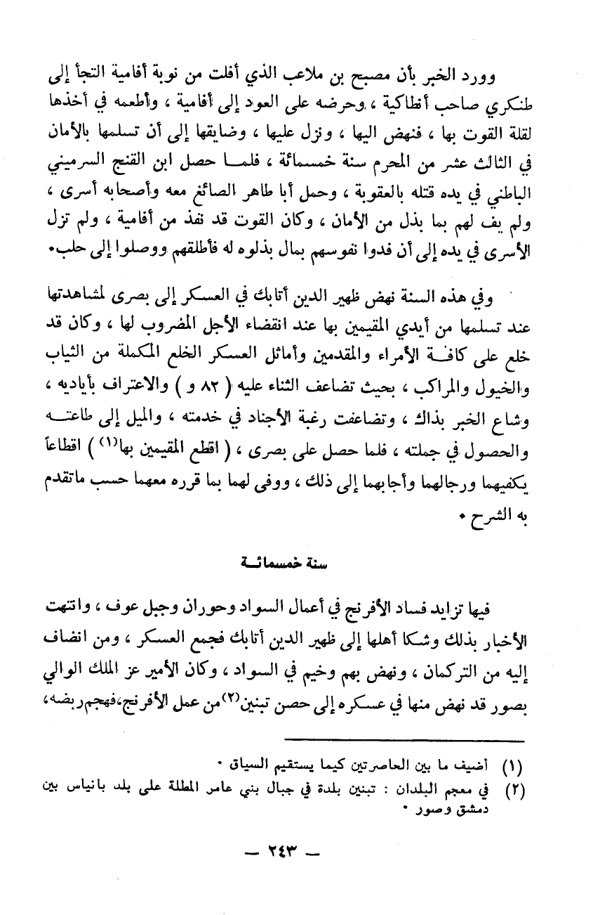 فيها تزايد فساد الافرنج في أعمال السواد وحوران وجبل عوف وانتهت الأخبار بذلك وشكوا أهلها إلى ظهير الدين أتابك فجمع العسكر ومن انضاف إليه من التركمان ونهض بهم وخيم في السواد. وكان الأمير عز الملك الوالي بصور قد نهض منها في عسكره إلى حصن تبين من عمل الافرنج فهجم ربضة