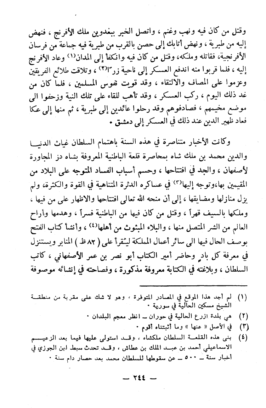وقتل من كان فيه ونهب وغنم واتصل الخبر ببغدوين ملك الافرنج فنهض إليه من طبرية ونهض أتابك إلى حصن بالقرب من طبرية فيه جماعة من فرسان الافرنجية فقاتله وملكه وقتل من كان فيه وانكفأ إلى المدان وعاد الافرنج إليه. فلما قربوا منه اندفع العسكر إلى ناحية زرا وتلاقت طلائع الفريقين وعزموا على المصاف والالتقاء وقد قويت نفوس المسلمين فلما كان من غد ذلك اليوم ركب العسكر وقد تأهب للقاء على تلك النية وزحفوا إلى موضع مخيمهم فصادفوهم وقد رحلوا عائدين إلى طبرية ثم منها إلى عكا فعاد ظهير الدين عند ذلك في العسكر إلى دمشق
