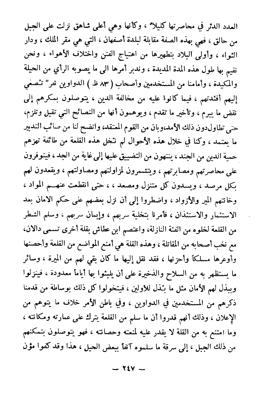 ودار الثواء وأولى البلاد بتطهيرها من اهتياج الفتن واختلاف الأهواء ونحن نقيم بها طول هذه المدة المديدة وندبر أمرها إلى ما يصونه الرأي من الحيلة والمكيدة وأمامنا من المستخدمين وأصحاب الدواوين نفر تصغي إليهم أفئدتهم فيما كانوا عليه من مخالفة الدين يتوصلون بمكرهم إلى نقض ما يبرم وتأخير ما تقدم ويوهمون إنها من النصائح التي تقبل وتلزم حتى تطاول دون ذلك الأمد وبان من القوم المعتقد واتضح لنا من صائب التدبير ما يعتمد وكنا في خلال هذه الأحوال لم نخل هذه القلعة من طائفة تهزهم حمية الدين من الجند ينتهون من التضييق عليها إلى كل غاية من الجد فيتوفرون على محاصرتهم ومصابرتهم ويتشمترون لمزاولتهم ومصاولتهم ويقعدون لهم بكل مرصد ويسدون كل متنزل ومصعد حتى انقطعت عنهم المواد وخانتهم المير والأزواد واضطروا إلى أن نزل بعضهم على حكم الأمان بعد الاستئمار والاستئذان فأمرنا بتخلية سربهم وايمان سربهم وسلم الشطر من القلعة لخلوه من الفئة النازلة واعتصم ابن عطاش بقلة اخرى تسمى دالان مع نخب أصحابه من المقاتلة وهذه القلة هي أمنع المواضع من القلعة وأحصنها وأوعرها مسلكاً وأحزنها فقد نقل إليها ما كان بقي لهم من الميرة وسائر ما يستظهر به من السلاح والذخيرة على أن يلبثوا بها أياماً معدودةً فينزلوا ويبذل لهم الأمان مثل ما بذل للأولين فيتحولوا كل ذلك بوساطة من قدمنا ذكرهم من المستخدمين في الدواوين وفي باطن الأمر خلاف ما يتوهم من الاعلان وذلك إنهم قدروا أن ما سلم من القلعة يترك على عمارته ومكانته وما امتنع به من القلة لا يقدر عليه لمنعته وحصانته فهم يتوصلون بتمكنهم من ذلك الحيل إلى سرقة ما سلموه آنفاً ببعض الحيل هذا وقد كفوا مؤن
