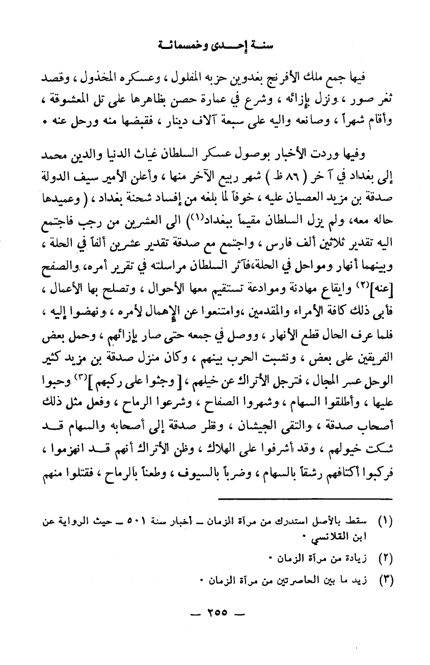 فيها جمع ملك الافرنج بغدوين حزبه المفلول وعسكره المخذول وقصد ثغر صور ونزل بإزائه وشرع في عمارة حصن بظاهرها على تل المعشوقة وأقام شهراً وصانعه واليه على سبعة آلاف دينار فقبضها منه ورحل عنه. وفيها وردت الأخبار بوصول عسكر السلطان غياث الدنيا والدين محمد إلى بغداد في آخر شهر ربيع الآخر منها وأعلن الأمير سيف الدولة صدقة بن مزيد العصيان عليه خوفاً لما بلغه من افساد شحنة بغداد وعمدها حاله معه ولم يزل السلطان مقيماً ببغداد إلى العشرين من رجب فاجتمع إليه تقدير ثلاثين ألف فارس واجتمع مع صدقة تقدير عشرين ألفاً في الحلة وبينهما أنهار وسواحل في الحلة فأثر السلطان مراسلته في تقرير أمره والصفح وإيقاع مهادنة وموادعة تستقيم معهما الأحوال ويصلح بها الأعمال فأبى ذلك كافة الأمراء والمقدمين وامتنعوا من الأهمال لأمره ونهضوا إليه. فلما عرف الحال قطع الأنهار ووصل في جمعه حتى صار بإزائهم وحمل بعض الفريقين على بعض ونشبت الحرب بينهم وكان منزل صدقة بن مزيد كثير الوحل عسر المجال فترجل الأتراك عن خيلهم وحثوا عليهم وأطلقوا السهام وشهروا الصفاح وشرعوا الرماح وفعل مثل ذلك أصحاب صدقة والتقى الجيشان ونظر صدقة إلى أصحابه والسهام قد شكت خيولهم وقد أشرفوا على الهلاك وظن الأتراك إنهم قد انهزموا فركبوا أكتافهم رشقاً بالسهام وضرباً بالسيوف وطعناً بالرماح فقتلوا منهم