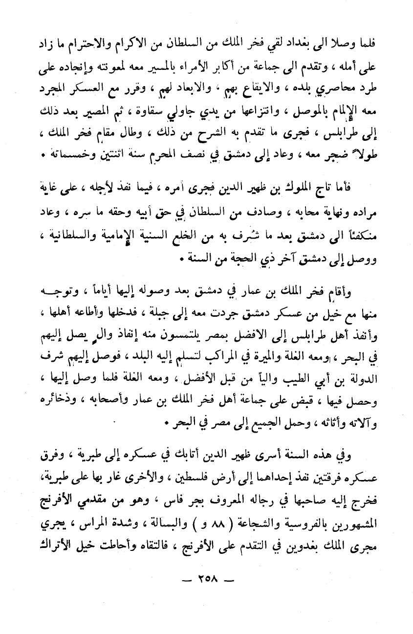 فلما وصلا إلى بغداد لقي فخر الملك من السلطان من الاكرام والاحترام ما زاد على أمله وتقدم إلى جماعة من أكابر الأمراء بالمسير معه لمعونته وانجاده على طرد محاصري بلده والايقاع بهم والابعاد لهم وقرر مع العسكر المجرد معه الالمام بالموصل وانتزاعها من يدي جاولي سقاوه ثم المصير بعد ذلك إلى طرابلس فجرى ما تقدم به الشرح من ذلك وطال مقام فخر الملك طولاً ضجر معه وعاد إلى دمشق في نصف المحرم سنة 502 فأما تاج الملوك بن ظهير الدين فجرى أمره فيما نفذ لأجله على غاية مراده ونهاية محابه وصادف من السلطان في حق أبيه وحقه ما سره وعاد منكفئاً إلى دمشق بعد ما شرف به من الخلع السنية الأمامية السلطانية ووصل إلى دمشق آخر ذي الحجة من السنة. وأقام فخر الملك بن عمار في دمشق بعد وصوله إليها أياماً وتوجه منها مع خيل من عسكر دمشق جردت معه إلى خيله فدخلها وأطاعه أهلها. وأنفذ أهل طرابلس إلى الأفضل بمصر يلتمسون منه انفاذ وال يصل إليهم في البحر ومعه الغلة والميرة في المراكب لتسلم إليه البلد فوصل إليهم شرف الدولة بن أبي الطيب والياً من قبل الأفضل ومعه الغلة فلما وصل إليها وحصل فيها قبض على جماعة أهل فخر الملك بن عمار وأصحابه وذخائره وألاته وأثاثه وحمل الجميع إلى مصر في البحر وفي هذه السنة أسرى ظهير الدين أتابك في عسكره إلى طبرية وفرق عسكره فرقتين نفذ إحداهما إلى أرض فلسطين والأخرى غاربها على طبرية فخرج إليه صاحبها في رجاله المعروف بجرفاس وهو من مقدمي الافرنج المشهورين بالفروسية والشجاعة والبسالة وشدة المراس يجري مجرى الملك بغدوين في التقدم على الافرنج فالتقاه وأحاطت خيل الأتراك