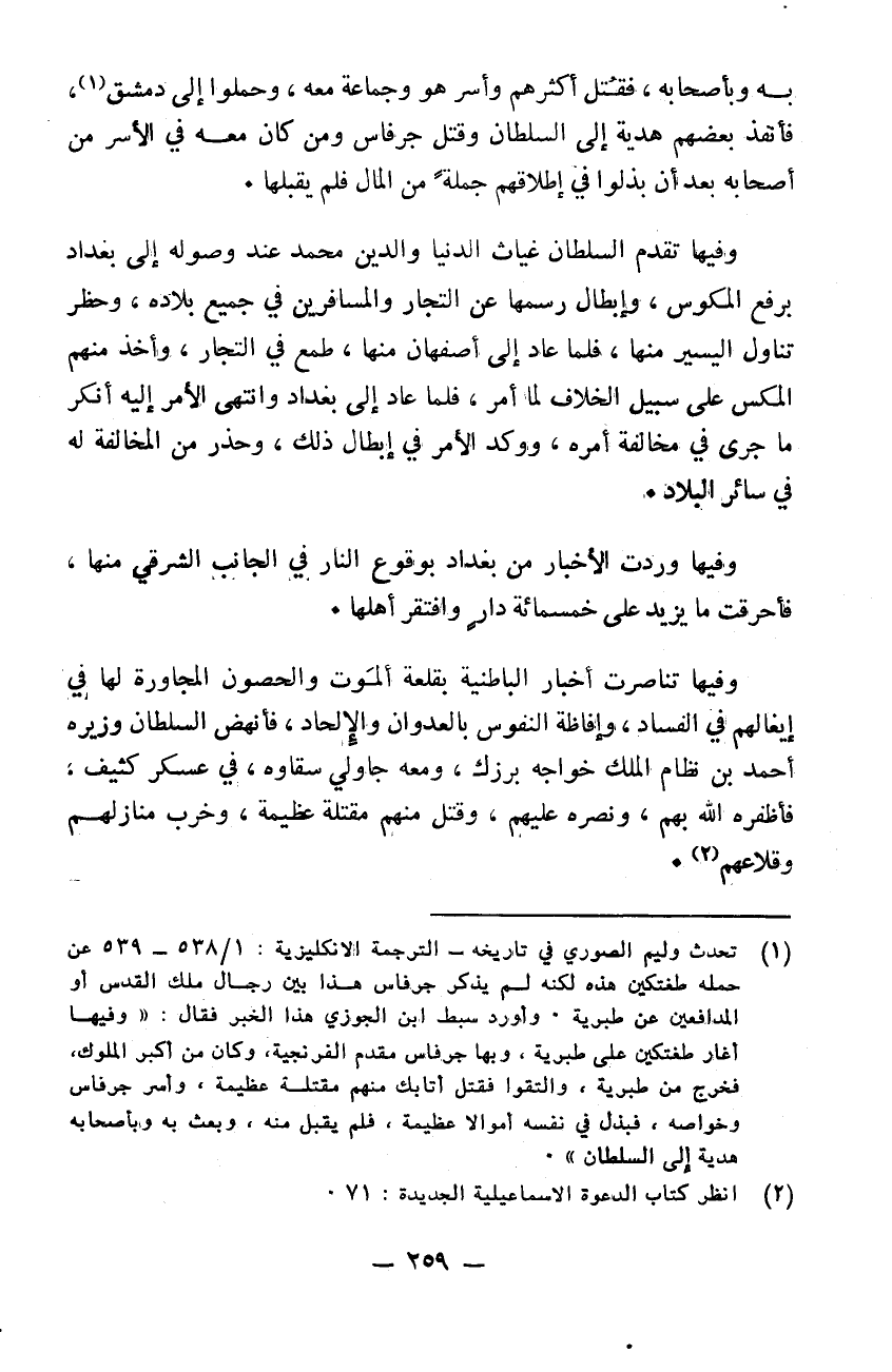 به وبأصحابه فقتل أكثرهم وأسر هو وجماعة معه وحملوا إلى دمشق فأنفذ بعضهم هدية إلى السلطان وقتل جرفاس ومن كان معه في الأسر من أصحابه بعد أن بذلوا في إطلاقهم جملةً من المال فلم يقبلها. وفيها تقدم السلطان غياث الدنيا والدين محمد عند وصوله إلى بغداد برفع المكوس وإبطال رسمها عن التجار والمسافرين في جميع بلاده وحظر تناول اليسير منها فلما عاد إلى أصفهان منها طمع في التجار وأخذ منهم المكس على سبيل الخلاف لما أمر فلما عاد إلى بغداد وانتهى الأمر إليه أنكر ما جرى في مخالفة أمره ووكد الأمر في إبطال ذلك وحذر من المخالفة له في سائر البلاد