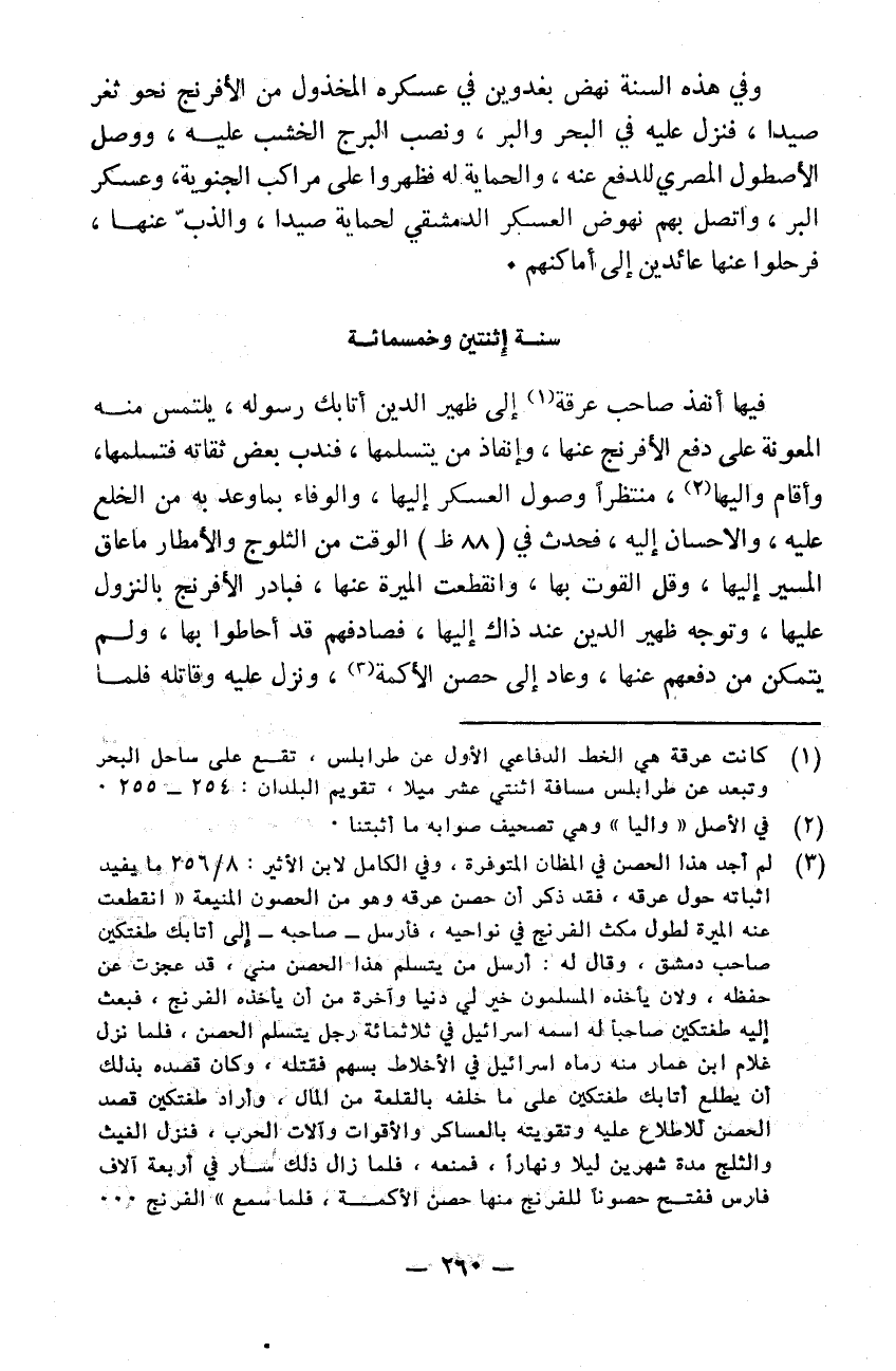 فيها أنفذ صاحب عرقة إلى ظهير الدين أتابك رسوله يلتمس منه المعونة على دفع الافرنج عنها وإنفاذ من يتسلمها فندب بعض ثقاته فتسلمها وأقام والياً بها منتظراً وصول العسكر إليها والوفاء بما وعد به من الخلع عليه والاحسان إليه فحدث في الوقت من الثلوج والأمطار ما عاق المسير إليها وقل القوت بها وانقطعت الميرة عنها فبادر الافرنج بالنزول عليها وتوجه ظهير الدين عند ذاك إليها فصادفهم قد أحاطوا بها ولم يتمكن من دفعهم عنها. وعاد إلى حصن الأكمة ونزل عليه وقاتله فلما