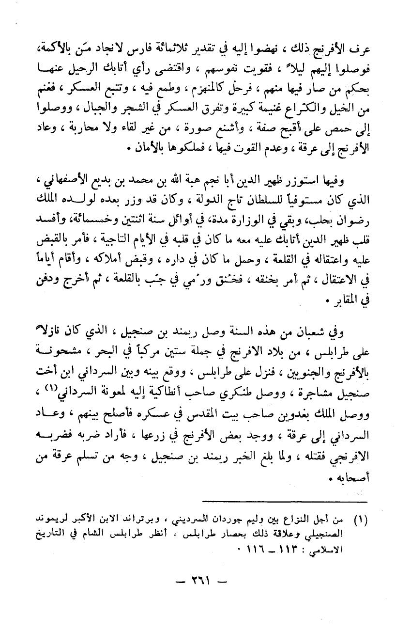 عرف الافرنج ذلك نهضوا إليه في تقدير ثلاثمائة فارس لانجاد من بالأكمة فوصلوا إليهم ليلاً فقويت نفوسهم واقتضى رأي أتابك الرحيل عنها بحكم من صار فيها منهم فرحل كالمنهزم وطمع فيه وتتبع العسكر فغنم من الخيل والكراع غنيمة كبيرة وتفرق العسكر في الشجر والجبال ووصلوا إلى حمص على أقبح صفة وأشنع صورة من غير لقاء ولا محاربة وعاد الافرنج إلى عرقة وعدم القوت فيها فملكوها بالأمان وفيها استوزر ظهير الدين أبا نجم هبة الله بن محمد بن بديع الأصفهاني الذي كان مستوفياً للسلطان تاج الدولة وكان قد وزر بعده لولده الملك رضوان بحلب وبقي في الوزارة مدة في أوائل سنة 502 وأفسد قلب ظهير الدين أتابك عليه مع ما كان في قلبه في الأيام التاجية فأمر بالقبض عليه واعتقاله في القلعة وحمل كل ما كان في داره وقبض أملاكه وأقام أياماً في الاعتقال ثم أمر بخنقه فخنق ورمي في جب بالقلعة ثم أخرج ودفن في المقابر وفي شعبان من هذه السنة وصل ريمند بن صنجيل الذي كان نازلاً على طرابلس من بلاد الافرنج في جملة ستين مركباً في البحر مشحونةً بالافرنج والجنويين فنزل على طرابلس ووقع بينه وبين السرداني ابن أخت صنجيل مشاجرة ووصل طنكري صاحب انطاكية إليه لمعونته للسرداني ووصل الملك بغدوين صاحب بيت المقدس في عسكره فأصلح بينهم. وعاد السرداني إلى عرقة ووجد بعض الافرنج في زرعها فأراد ضربه فضربه الافرنجي فقتله ولما بلغ الخبر ريمند بن صنجيل وجه من تسلم عرقة من أصحابه.
