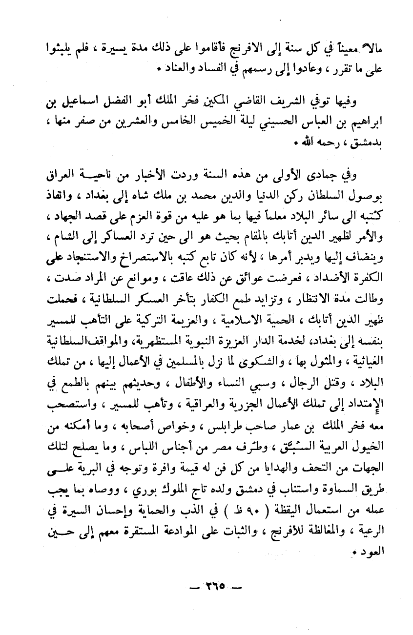 مالاً معيناً في كل سنة إلى الافرنج فأقاموا على ذلك مدةً يسيرةً فلم يلبثوا على ما تقرر وعادوا إلى رسمهم في الفساد والعناد وفيها توفي الشريف القاضي المكين فخر الملك أبو الفضل اسمعيل بن ابرهيم بن العباس الحسيني ليلة الخميس الخامس والعشرين من صفر منها بدمشق رحمه الله