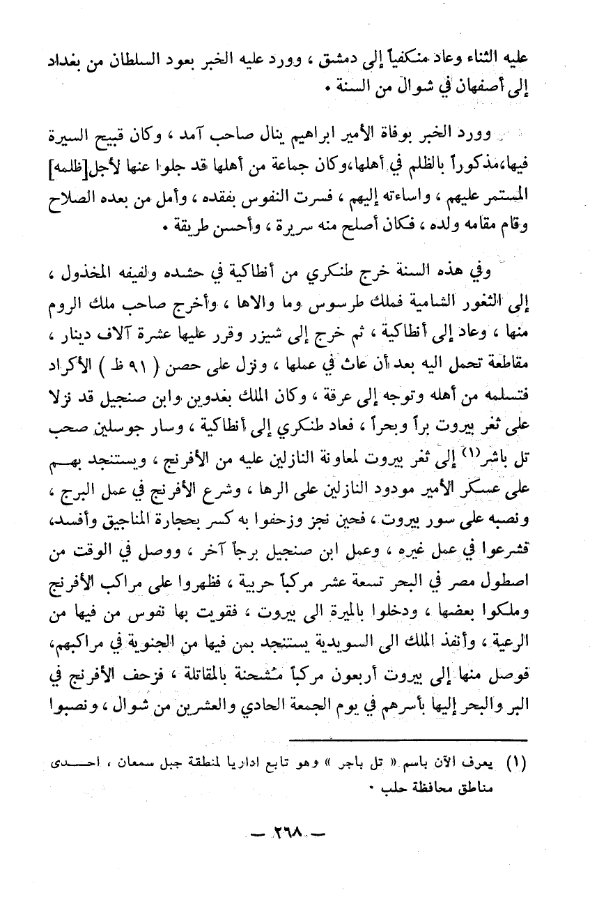 عليه الثناء وعاد منكفياً إلى دمشق. وورد عليه الخبر بعود السلطان من بغداد إلى أصفهان في شوال من السنة وورد الخبر بوفاة الأمير ابرهيم ينال صاحب آمد وكان قبيح السيرة فيها مذكوراً بالظلم في أهلها وكان جماعة من أهلها قد خلوا عنها لأجله المستمر عليهم واساءته إليهم فسرت النفوس بفقده وأمل من بعده الصلاح وقام مقامه ولده فكان أصلح منه سريرةً وأحسن طريقةً وفي هذه السنة خرج طنكري من أنطاكية في حشده ولفيفه المخذول إلى الثغور الشامية فملك طرسوس وما والاها وأخرج صاحب ملك الروم منها وعاد إلى أنطاكية ثم خرج إلى شيزر وقرر عليها عشرة آلاف دينار مقاطعةً تحمل إليه بعد أن عاث في عملها ونزل على حصن الأكراد فتسلمه من أهله وتوجه إلى عرقة وكان الملك بغدوين وابن صنجيل قد نزلا على ثغر بيروت براً وبحراً فعاد طنكري إلى أنطاكية وسار جوسلين صاحب تل باشر إلى ثغر بيروت لمعاونة النازلين عليه من الافرنج ويستنجد بهم على عسكر الأمير مودود النازلين على الرها. وشرع الافرنج في عمل البرج ونصبه على سور بيروت فحين نجز وزحفوا به كسر بحجارة المناجيق وأفسد فشرعوا في عمل غيره وعمل ابن صنجيل برجاً آخر ووصل في الوقت من اصطول مصر في البحر تسعة عشر مركباً حربية فظهروا على مراكب الافرنج وملكوا بعضها ودخلوا بالميرة إلى بيروت فقويت بها نفوس من فيها من الرعية. وأنفذ الملك بغدوين إلى السويدية يستنجد بمن فيها من الجنوية في مراكبهم فوصل منها إلى بيروت أربعون مركباً مشحنةً بالمقاتلة فزحف الافرنج في البر والبحر إليها بأسرهم في يوم الجمعة الحادي والعشرين من شوال ونصبوا