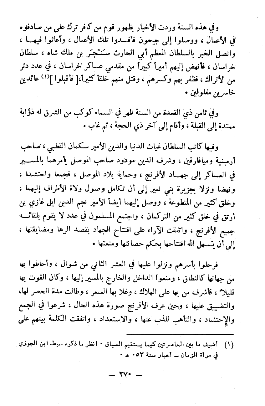 وفي هذه السنة وردت الأخبار بظهور قوم كافر نزل على من صادفوه في الأعمال ووصلوا إلى جيحون فأفسدوا تلك الأعمال وأعاثوا فيها واتصل الخبر بالسلطان المعظم أبي الحرث سنجر بن ملك شاه سلطان خراسان فانهض إليهم أميراً كبيراً من مقدمي عساكر خراسان في عدد دثر من الأتراك فظفر بهم وكسرهم وقتل منهم خلقاً كثيراً عائدين خاسرين مفلولين وفي ثامن من ذي القعدة من السنة ظهر في السماء كوكب من الشرق له ذؤابة ممتدة إلى القبلة وأقام إلى آخر ذي الحجة ثم غاب. وفيها كاتب السلطان غياث الدنيا والدين الأمير سكمان القطبي صاحب أرمينية وميافارقين وشرف الدين مودود صاحب الموصل يأمرهما بالمسير في العساكر إلى جهاد الافرنج وحماية بلاد الموصل فجمعا واحتشدا ونهضا ونزلا بجزيرة بني نمير إلى أن تكامل وصول ولاة الأطراف إليهما وخلق كثير من المتطوعة ووصل إليهما أيضاً الأمير نجم الدين ايل غازي بن ارتق في خلق كثير من التركمان واجتمع المسلمون في عدد لا يقوم بلقائه جميع الافرنج. واتفقت الآراء على افتتاح الجهاد بقصد الرها ومضايقتها إلى أن يسهل الله افتتاحها بحكم حصانتها ومنعتها. فرحلوا بأسرهم ونزلوا عليها في العشر الثاني من شوال وأحاطوا بها من جهاتها كالنطاق ومنعوا الداخل والخارج بالمسير إليها وكان القوت بها قليلاً فأشرف من بها على الهلاك وغلا بها السعر وطالت مدة الحصر لها والتضييق عليها. وحين عرف الافرنج صورة هذه الحال شرعوا في الجمع والاحتشاد والتأهب للذب عنها والاستعداد واتفقت الكلمة بينهم على
