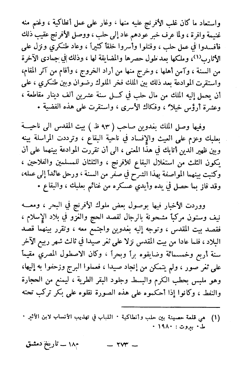 واستعاد ما كان غلب الافرنج عليه منها وغار على عمل انطاكية وغنم منه غنيمةً وافرة ولما عرف خبر عودهم عاد إلى حلب. ووصل الافرنج عقيب ذلك فأفسدوا في عمل حلب وقتلوا وأسروا خلقاً كثيراً وعاد طنكري ونزل على الأثارب وملكها بعد طول حصرها والمضايقة لها وذلك في جمادى الآخرة من السنة وأمن أهلها وخرج منها من أراد الخروج وأقام من أثر المقام واستقرت الموادع بعد ذلك بين الملك فخر الملوك رضوان وبين طنكري على أن يحمل إليه الملك من مال حلب في كل سنة عشرين ألف دينار مقاطعةً وعشرة أرؤس خيلاً وفكاك الأسرى واستقرت على هذه القضية وفيها وصل الملك بغدوين صاحب بيت المقدس إلى ناحية بعلبك وعزم على العيث والافساد في ناحية البقاع وترددت المراسلة بينه وبين ظهير الدين أتابك في هذا المعنى إلى أن تقررت الموادعة بينهما على أن يكون الثلاث من استغلالات البقاع للافرنج والثلاثان للمسلمين والفلاحين وكتب بيهما المواصفة بهذا الشرح في صفر من السنة ورحل عائداً إلى عمله وقد فاز بما حصل في يده وأيدي عسكره من غنائم بعلبك والبقاع ووردت الأخبار فيها بوصول بعض ملوك الافرنج في البحر ومعه نيف وستون مركباً مشحونة بالرجال لقصد الحج والغزو في بلاد الاسلام فقصد بيت المقدس وتوجه إليه بغدوين واجتمع معه وتقرر بينهما قصد البلاد الاسلامية. فلما عادا من بيت المقدس نزلا على ثغر صيدا في ثالث شهر ربيع الآخر سنة 504 وضايقوه براً وبحراً. وكان الاسطول المصري مقيماً على ثغر صور ولم يتمكن من انجاد صيدا فعملوا البرج وزحفوا به إليها وهو ملبس بحطب الكرم والبسط وجلود البقر الطرية ليمنع من الحجارة والنفط وكانوا إذا أحكموه على هذه الصورة نقلوه على بكر تركب تحته