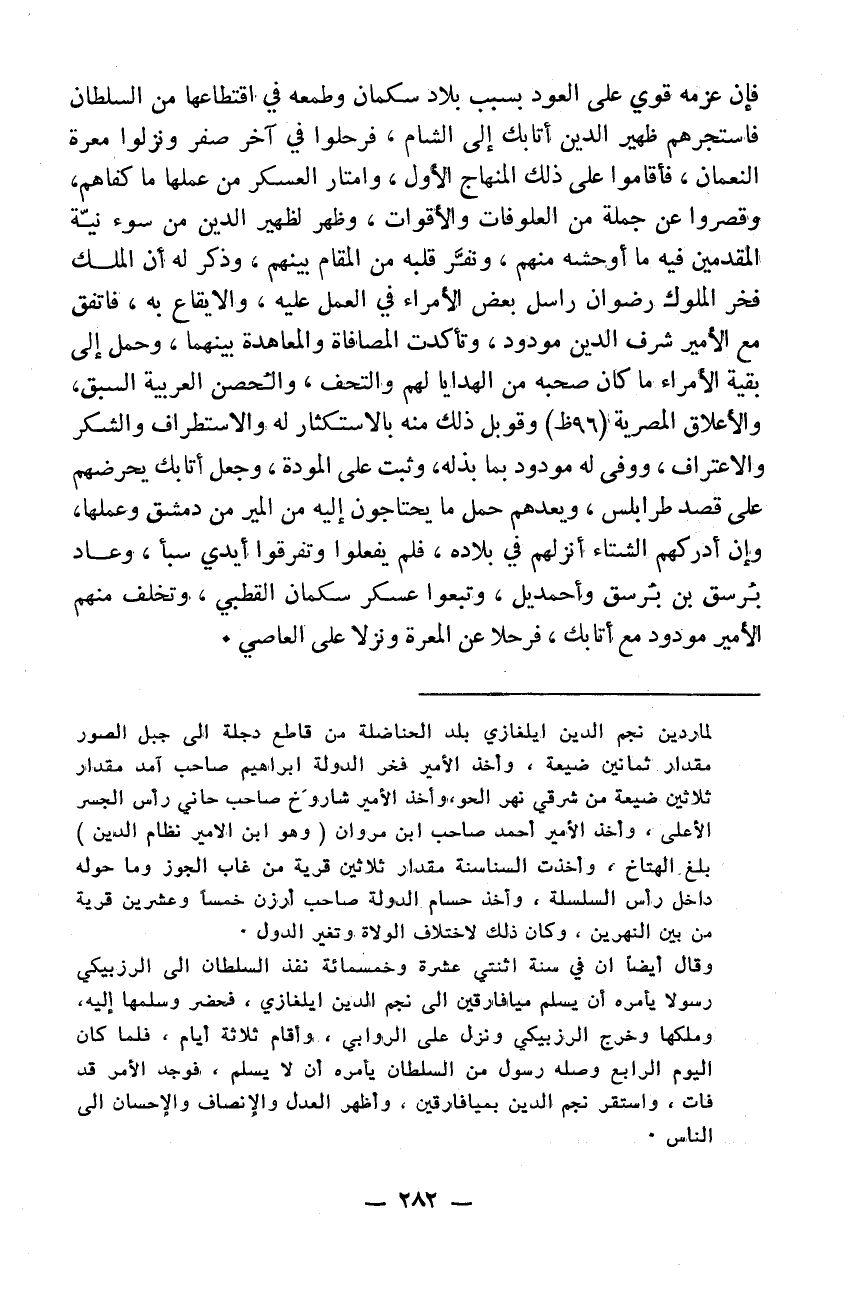 فإن عزمه قوي على العود بسبب بلاد سكمان وطمعه في اقتطاعها من السلطان فاستجرهم ظهير الدين أتابك إلى الشام فرحلوا في آخر صفر ونزلوا معرة النعمان فأقاموا على ذلك المنهاج الأول وامتار العسكر من عملها ما كفاهم وقصروا عن حملة من العلوفات والأقوات وظهر لظهير الدين من سوء نية المقدمين فيه ما أوحشه منهم ونفر قلبه من المقام بينهم وذكر له أن الملك فخر الملوك رضوان راسل بعض الأمراء في العمل عليه والايقاع به فاتفق مع الأمير شرف الدين مودود وتأكدت المصافاة والمعاهدة بينهما وحمل إلى بقية الأمراء ما كان صحبه من الهدايا لهم والتحف والحصن العربية السبق والاعلاق المصرية وقوبل ذلك منه بالاستكثار له والاستطراف والشكر والاعتراف ووفى له مودود بما بذله وثبت على المودة وجعل أتابك يحرضهم على قصد طرابلس ويعدهم حمل ما يحتاجون إليه من المير من دمشق وعملها وإن أدركهم الشتاء أنزلهم في بلاده فلم يفعلوا وتفرقوا أيدي سبا وعاد برسق بن برسق وأحمديل وتبعوا عسكر سكمان القطبي وتخلف منهم الأمير مودود مع أتابك فرحلا عن المعرة ونزلا على العاصي