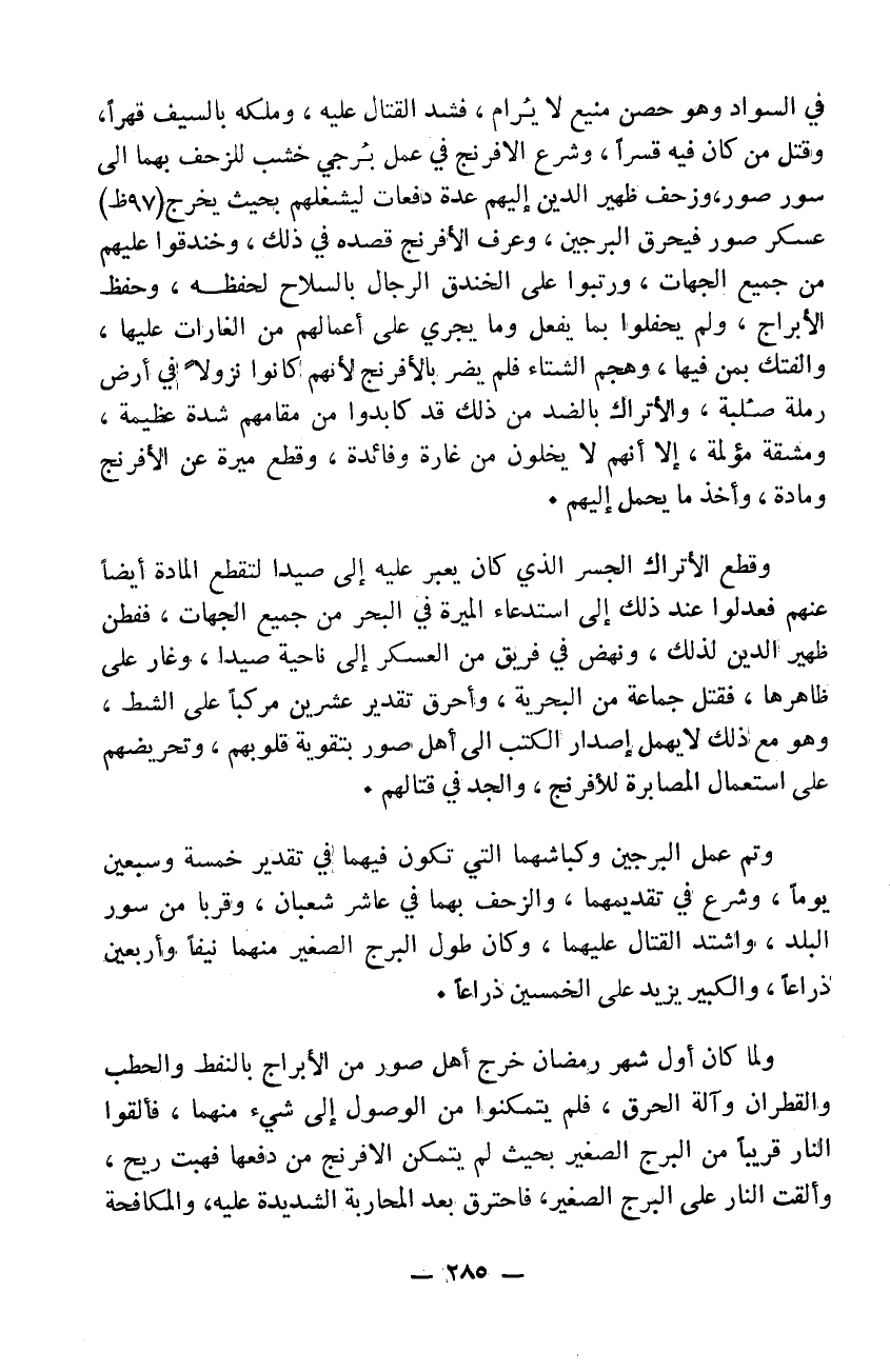 في السواد وهو حصن منيع لا يرام فشد القتال عليه وملكه بالسيف قهراً وقتل من كان فيه قسراً وشرع الافرنج في عمل برجي خشب للزحف بهما إلى سور صور وزحف ظهير الدين إليهم عدة دفعات ليشغله بحيث يخرج عسكر صور فيحرق البرجين وعرف الافرنج قصده في ذلك وخندقوا عليهم من جميع الجهات ورتبوا على الخندق الرجال بالسلاح لحفظه وحفظ الأبراج ولم يحفلوا بما يفعل وما يجري على أعمالهم من الغارات عليها والفتك بمن فيها. وهجم الشتاء فلم يضر بالافرنج لأنهم كانوا نزولاً في أرض رملة صلبة والأتراك بالضد من ذلك قد كابدوا من مقامهم شدةً عظيمة ومشقةً مؤلمة إلا إنهم لا يخلون من غارة وفائدة وقطع ميرة عن الافرنج ومادة وأخذ ما يحمل إليهم وقطع الأتراك الجسر الذي كان يعبر عليه إلى صيدا ليقطع المادة أيضاً عنها فعدلوا عند ذلك إلى استدعاء الميرة في البحر من جميع الجهات ففطن ظهير الدين لذلك ونهض في فريق من العسكر إلى ناحية صيدا وغار على ظاهرها فقتل جماعة من البحرية وأحرق تقدير عشرين مركباً على الشط وهو مع ذلك لا يهمل إصدار الكتب إلى أهل صور بتقوية قلوبهم وتحريضهم على استعمال المصابرة للافرنج والجد في قتالهم