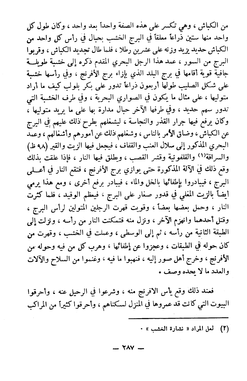 من الكباش وهي تكسر على هذه الصفة واحداً بعد واحد وكان طول كل واحد منها ستين ذراعاً معلقاً في البرج الخشب بحبال في رأس كل واحد من الكباش حديد يزيد وزنه على عشرين رطلاً. فلما طال تجديد الكباش وقربوا البرج من السور عمد هذا الرجل البحري المقدم ذكره إلى خشبة طويلة جافية قوية أقامها في برج البلد الذي بإزاء برج الافرنج وفي رأسها خشبة على شكل الصليب طولها أربعون ذراعاً تدور على بكر بلولب كيف ما أراد متوليها على مثال ما يكون في الصواري البحرية وفي طرف الخشبة التي تدور سهم حديد وفي طرفها الآخر حبال مدارة بها على ما يريد متوليها وكان يرفع فيها جرار الكدر والنجاسة ليشغلهم بطرح ذلك عليهم في البرج عن الكباش. وضاق الأمر بالناس وشغلهم ذلك عن أمورهم وأشغالهم وعمد البحري المذكور إلى سلال العنب والقفاف فيجعل فيها الزيت والقير والسراقة والقلفونية وقشر القصب ويطلق فيها النار فإذا علقت بذلك وقع ذلك في الآلة المذكورة حتى يوازي برج الافرنج فتقع النار في أعلى البرج فيبادروا باطفائها بالخل والماء فيبادر برفع اخرى ومع هذا يرمي أيضاً بالزيت المغلي في قدور صغار على البرج فيعظم الوقيد. فلما كثرت النار وحمل بعضها بعضاً وقويت قهرت الرجلين المتولين لرأس البرج وقتل أحدهما وانهزم الآخر ونزل منه فتمكنت النار من رأسه ونزلت إلى الطبقة الثانية من رأسه ثم إلى الوسطى وعملت في الخشب وقهرت من كان حوله في الطبقات وعجزوا عن اطفائها وهرب كل من فيه وحوله من الافرنج وخرج أهل صور إليه فنهبوا ما فيه وغنموا من السلاح والآلات والعدد ما لا يحده وصف