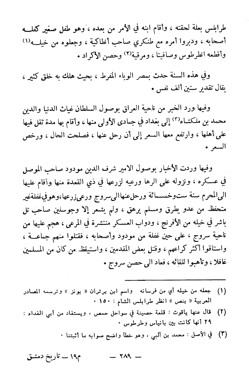 طرابلس بعلة لحقته وأقام ابنه في الأمر من بعده وهو طفل صغير كفله أصحابه ودبروا أمره مع طنكري صاحب أنطاكية وجعلوه من خيله وأقطعه انطرطوس وصافيثا ومرقية وحصن الأكراد وفي هذه السنة حدث بمصر الوباء المفرط بحيث هلك به خلق كثير يقال تقدير ستين ألف نفس. وفيها ورد الخبر من ناحية العراق بوصول السلطان غياث الدنيا والدين محمد بن البي كذا إلى بغداد في جمادى الأولى منها وأقام بها مدة ثقل فيها على أهلها وارتفع معها السعر إلى أن رحل عنها فصلحت الحال ورخص السعر. وفيها وردت الأخبار بوصول الأمير شرف الدين مودود صاحب الموصل في عسكره ونزوله على الرها ورعيه لزرعها في ذي القعدة منها وأقام عليها إلى المحرم سنة 506 ورحل عنها إلى سروج ورعى زرعها وهو في غفلة غير متحفظ من عدو يطرق ومسلم يرهق ولم يشعر إلا وجوسلين صاحب تل باشر في خيله من الافرنج ودواب العسكر منتشرة في المرعى هجم عليها من ناحية سروج على حين غفلة من مودود وأصحابه فقتلوا منهم جماعة فاستاقوا أكثر كراعهم وقتل بعض المقدمين واستيقظ من كان من المسلمين غافلاً وتأهبوا للقائه فعاد إلى حصن سروج