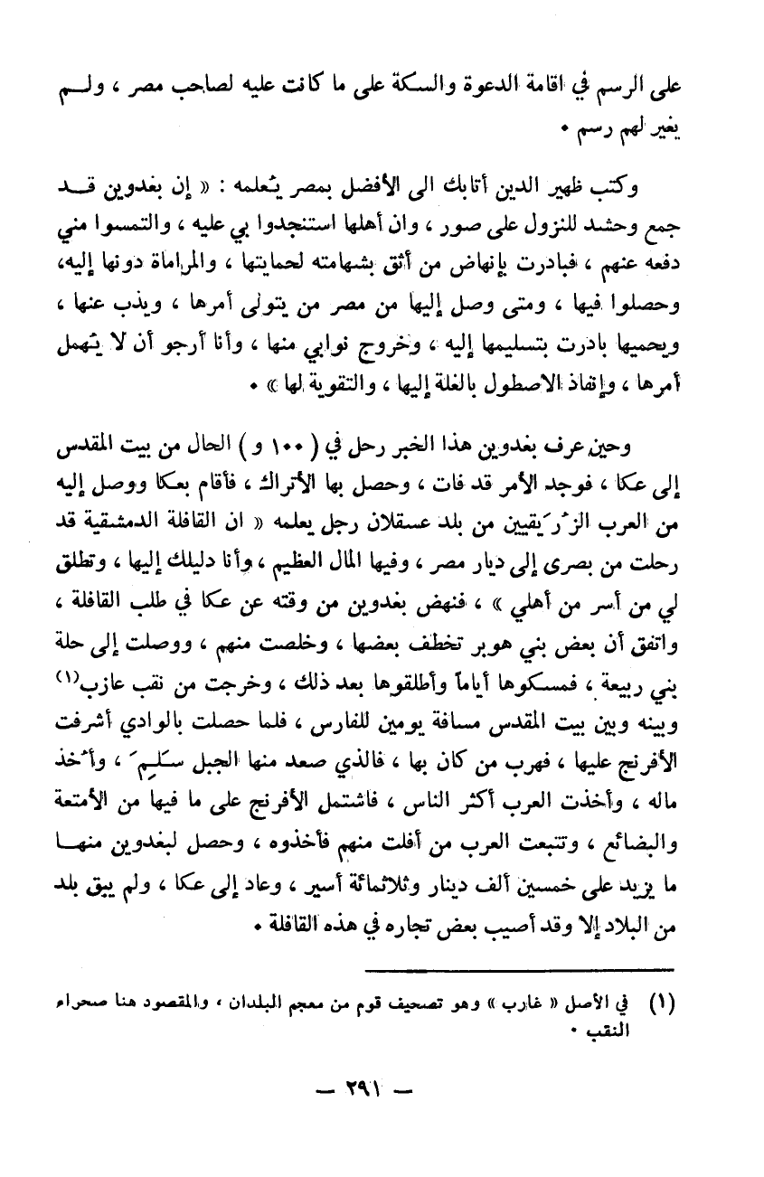 على الرسم في إقامة الدعوة والسكة على ما كانت عليه لصاحب مصر ولم يغير لهم رسم وكتب ظهير الدين أتابك إلى الأفضل بمصر يعلمه: أن بغدوين قد جمع وحشد للنزول على صور وأن أهلها استنجدوا بي عليه والتمسوا مني دفعه عنهم فبادرت بانهاض من أثق بشهامته لحمايتها والمراماة دونها إليه وحصلوا فيها ومتى وصل إليها من مصر من يتولى أمرها ويذب عنها ويحميها بادرت بتسليمها إليه وخروج نوابي منها وأنا أرجو أن لا يهمل أمرها وانفاذ الاسطول بالغلة إليها والتقوية لها. وحين عرف بغدوين هذا الخبر رحل في الحال من بيت المقدس إلى عكا فوجد الأمر قد فات وحصل بها الأتراك فأقام بعكا ووصل إليه من العرب الزريقيين من بلد عسقلان رجل يعلمه أن القافلة الدمشقية قد رحلت من بصرى إلى ديار مصر وفيها المال العظيم وأنا دليلك إليها وتطلق لي من أسر من أهلي فنهض بغدوين من وقته عن عكا في طلب القافلة واتفق أن بعض بني هوبر تخطف بعضها وخلصت منهم ووصلت إلى حلة بني ربيعة فمسكوها أياماً وأطلقوها بعد ذلك وخرجت من نقب عازب وبينه وبين بيت المقدس مسافة يومين للفارس فلما حصلت بالوادي أشرفت الافرنج عليها فهرب من كان بها فالذي صعد منها الجبل سلم وأخذ ماله وأخذت العرب أكثر الناس فاشتمل الافرنج على ما فيها من الأمتعة والبضائع وتتبعت العرب من أفلت منهم فأخذوه وحصل لبغدوين منها ما يزيد على خمسين ألف دينار وثلاثمائة أسير وعاد إلى عكا ولم يبق بلد من البلاد إلا وقد أصيب بعض تجاره في هذه القافلة.