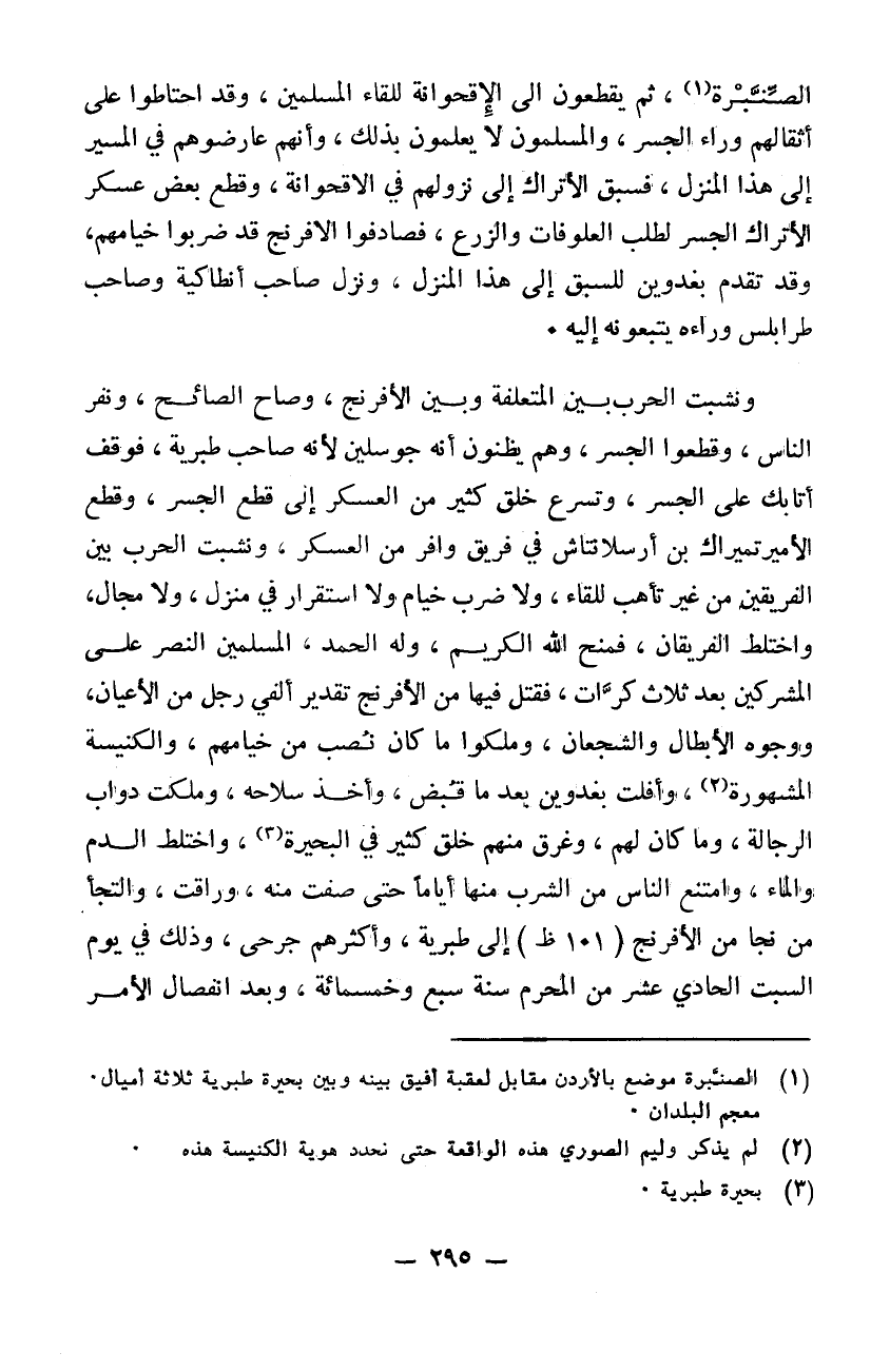ونشبت الحرب بين المتعلفة وبين الافرنج وصاح الصائح ونفر الناس وقطعوا الجسر وهم يظنون أنه جوسلين لأنه صاحب طبرية فوقف أتابك على الجسر وتسرع خلق كثير من العسكر إلى قطع الجسر وقطع الأمير تميراك بن أرسلانتاش في فريق وافر من العسكر ونشبت الحرب بين الفريقين من غيرتا هب للقاء ولا ضرب خيام ولا استقرار في منزل ولا مجال واختلط الفريقان فمنح الله الكريم له الحمد المسلمين النصر على المشكرين بعد ثلاث كرات فقتل فيها من الافرنج تقدير ألفي رجل من الأعيان ووجوه الأبطال والشجعان وملكوا ما كان نصب من خيامهم والكنيسة المشهورة وأفلت بغدوين بعد ما قبض وأخذ سلاحه وملكت دواب الرجالة وما كان لهم وغرق منهم خلق كثير في البحيرة واختلط الدم والماء وامتنع الناس من الشرب منها أياماً حتى صفت منه وراقت والتجأ من نجا من الافرنج إلى طبرية وأكثرهم جرحى وذلك في يوم السبت الحادي عشر من المحرم سنة 507. وبعد انفصال الأمر