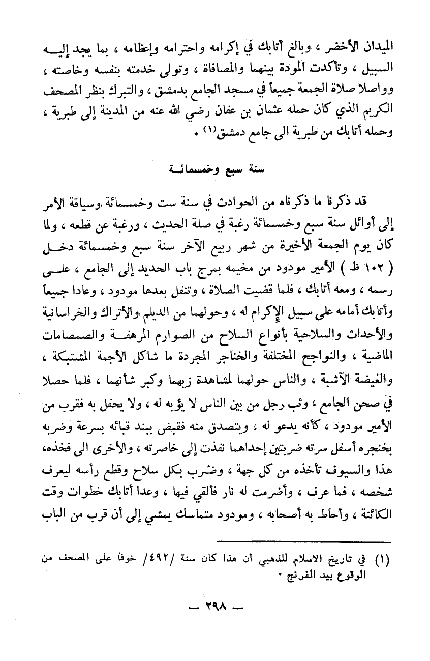 قد ذكرنا ما ذكرناه من الحوادث في سنة 506 وسياقة الأمر إلى أوائل سنة 507 رغبةً في صلة الحديث ورغبةً عن قطعه. ولما كان يوم الجمعة الأخيرة من شهر ربيع الآخر سنة 507 دخل الأمير مودود من مخيمه بمرج باب الحديد إلى الجامع على رسمه ومعه أتابك فلما قضيت الصلاة وتنفل بعضها مودود وعادا جميعاً وأتابك أمامه على سبيل الاكرام له وحولهما من الديلم والخراسانية والأحداث والسلاحية بأنواع السلاح من الصوارم المرهفة والصمصامات الماضية والنواحل المختلفة والخناجر المجردة ما شاكل الأجمة المشتبكة والغيضة الآشبة والناس حولهما لمشاهدة زيهما وكبر شأنهما فلما حصلا في صحن الجامع وثب رجل من بين الناس لا يؤبه له ولا يحفل به فقرب من الأمير مودود كأنه يدعو له ويتصدق منه فقبض ببند قبائه بسرعة وضربه بخنجره أسف سرته ضربتين إحداهما نفذت إلى خاصرته والأخرى إلى فخذه هذا والسيوف تأخذه من كل جهة وضرب بكل سلاح وقطع رأسه ليعرف شخصه فما عرف وأضرمت له نار فألقي فيها. وعدا أتابك خطوات وقت الكائنة وأحاط به أصحابه ومودود متماسك يمشي إلى أن قرب من الباب
