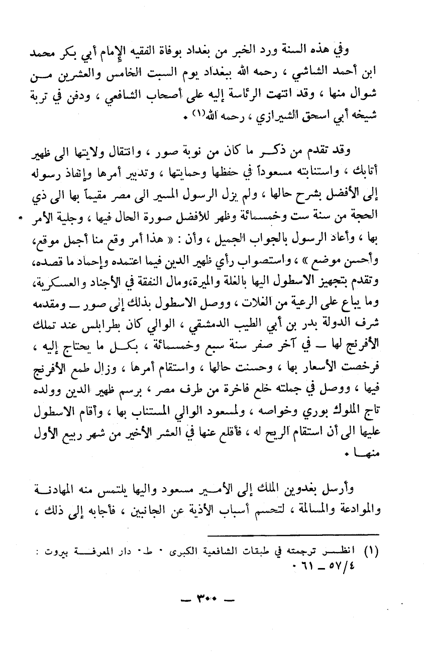 وفي هذه السنة ورد الخبر من بغداد بوفاة الفقيه الامام أبي بكر محمد بن أحمد الشاشي رحمه الله ببغداد يوم السبت الخامس والعشرين من شوال منها وقد انتهت الرئاسة إليه على أصحاب الشافعي ودفن في تربة شيخه أبي إسحق الشيرازي رحمه الله قد تقدم من ذكر ما كان من نوبة صور وانتقال ولايتها إلى ظهير الدين أتابك واستنابته مسعوداً في حفظها وحمايتها وتدبير أمرها وانفاذ رسوله إلى الأفضل بشرح حالها ولم يزل الرسول المسير إلى مصر مقيماً بها إلى ذي الحجة من سنة 506 وظهر للأفضل صورة الحال فيها وجلية الأمر بها وأعاد الرسول بالجواب الجميل وإن: هذا أمر وقع منا أجمل موقع وأحسن موضع واستصواب رأي ظهير الدين فيما اعتمده وإحماد ما قصده. وتقدم بتجهيز الاسطول إليها بالغلة والميرة ومال النفقة في الأجناد والعسكرية وما يباع على الرعية من الغلات ووصل الاسطول بذلك إلى صور ومقدمه شرف الدولة بدر بن أبي الطيب الدمشقي الوالي كان بطرابلس عند تملك الافرنج لها في آخر صفر سنة 507 بكل ما يحتاج إليه فرخصت الأسعار بها وحسنت حالها واستقام أمرها وزال طمع الافرنج فيها. ووصل في جملته خلع فاخرة من طرف مصر رسم ظهير الدين وولده تاج الملوك بوري وخواصه ولمسعود الوالي المستناب بها وأقام الاسطول عليها إلى أن استقام الريح له فأقلع عنها في العشر الأخير من شهر ربيع الأول منها. وأرسل بغدوين الملك إلى الأمير مسعود واليها يلتمس منه المهادنة والموادعة والمسالمة لتحسم أسباب الأذية عن الجانبين فأجابه إلى ذلك