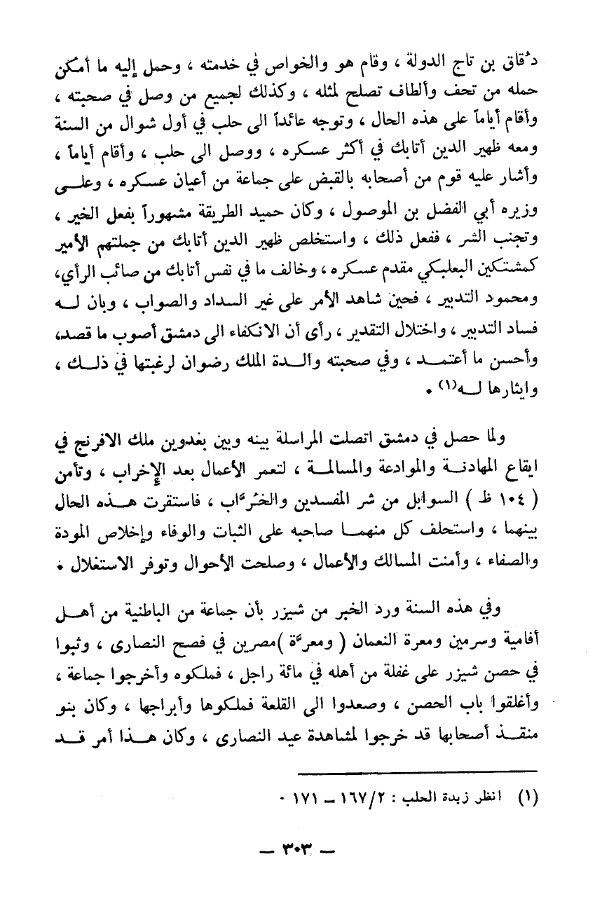 دقاق بن تاج الدولة وقام هو والخواص في خدمته وحمل إليه ما أمكن حمله من تحف وألطاف تصلح لمثله وكذلك لجميع من وصل في صحبته وأقام أياماً على هذه الحال وتوجه عائداً إلى حلب في أوال شوال من السنة ومعه ظهير الدين أتابك في أكثر عسكره ووصل إلى حلب وأقام أياماً. وأشار عليه قوم من أصحابه بالقبض على جماعة من أعيان عسكره وعلى وزيره أبي الفضل بن الموصول وكان حميد الطريقة مشهوراً بفعل الخير وتجنب الشر ففعل ذلك واستخلص ظهير الدين أتابك من جملتهم الأمير كمشتكين البعلبكي مقدم عسكره وخالف ما في نفس أتابك من صائب الرأي ومحمود التدبير فحين شاهد الأمر على غير السداد والصواب وبان له فساد التدبير واختلاف التقدير رأى أن الانكفاء إلى دمشق أصوب ما قصد وأحسن ما اعتمد وفي صحبته والدة الملك رضوان لرغبتها في ذلك وايثارها له. ولما حصل في دمشق اتصلت المراسلة بينه وبين بغدوين ملك الافرنج في ايقاع المهادنة والموادعة والمسالمة لتعمر الأعمال بعد الأخراب وتأمن السوابل من شر المفسدين والخراب فاستقرت هذه الحال بينهما واستحلف كل واحد منهما صاحبه على الثبات والوفاء واخلاص المودة والصفاء وأمنت المسالك والأعمال وصلحت الأحوال وتوفر الاستغلال