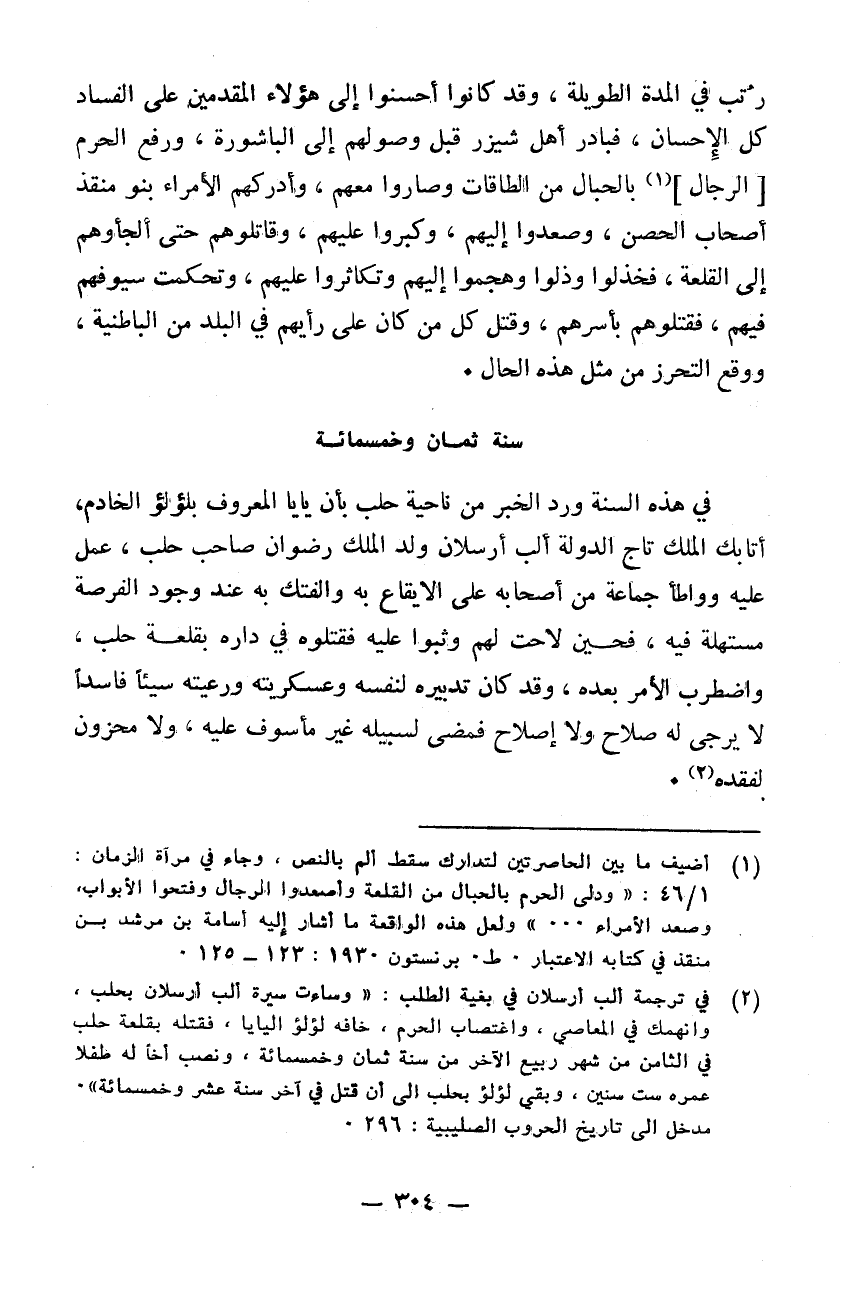 رتب في المدة الطويلة وقد كانوا أحسنوا إلى هؤلاء المقدمين على الفساد كل الاحسان فبادر أهل شيزر قبل وصولهم إلى الباشورة ورفع الحرم بالحبال من الطاقات وصاروا معهم وأدركهم الأمراء بنو منقذ أصحاب الحصن وصعدوا إليهم وكبروا عليهم وقاتلوهم حتى الجأوهم إلى القلعة فخذلوا وذلوا وهجموا إليهم وتكاثروا عليهم وتحكمت سيوفهم فيهم فقتلوهم بأسرهم وقتل كل من كان على رأيهم في البلد من الباطنية ووقع التحرز من مثل هذه الحال