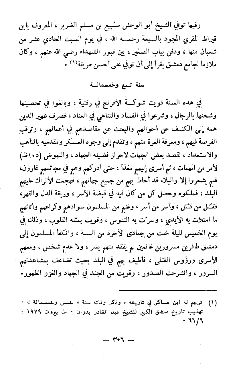 وفيها توفي الشيخ أبو الوحش سبيع بن مسلم الضرير المعروف بابن قيراط المقري المجود بالسبغة رحمه الله في يوم السبت الحادي عشر من شعبان منها ودفن بباب الصغير بين قبور الشهداء رضي الله عنهم وكان ملازماً لجامع دمشق يقرأ إلى أن توفي على حسن طريقه