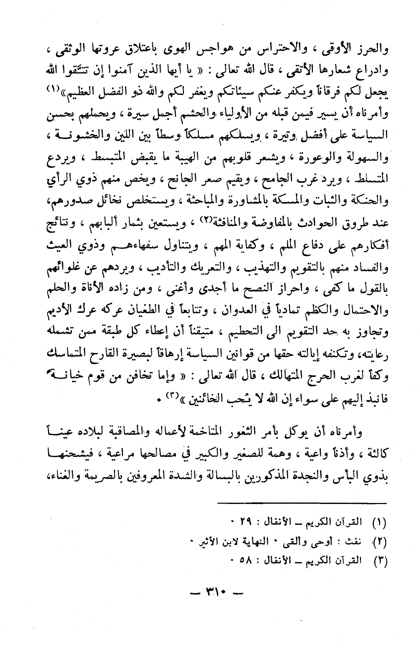 والمباحثة ويستخلص نخائل صدورهم عند طروق الحوادث بالمفاوضة والمنافثة ويستعين بثمار ألبابهم ونتائج أفكارهم على دفاع الملم وكفاية المهم ويتناول سفهاءهم وذوي العيث والفساد منهم بالتقويم والتهذيب والتعريك والتأديب ويردهم عن غلوائهم بالقول ما كفى وأحرز النصح ما أجدى وأغنى ومن زاده الأناة والحلم والاحتمال والكظم تمادياً في العدوان وتتابعاً في الطغيان عركه عرك الأديم وتجاوز به حد التقويم إلى التحطيم متيقناً إن إعطاء كل طبقة ممن تشمله رعايته وتكنفه إيالته حقها من قوانين السياسة إرهاقاً لبصيرة القارح المتمسك وكفاً لغرب الحرج المتهالك. قال الله تعالى: " وَإِمَّا تخافنَّ مِنْ قومٍ خِيانَةً فأنْبِذْ إِلَيهِم على سَواءٍ إِنَّ اللهَ لا يُحبُّ الخائنينَ " وأمرناه أن يوكل بأمر الثغور المتاخمة لأعماله والمصاقبة لبلاده عيناً كالئةً وأذناً واعيةً وهمةً للصغير والكبير في مصالحها مراعية فيشحنها بذوي البأس والنجدة المذكورين بالبسالة والشدة المعروفين بالصريمة والغناء