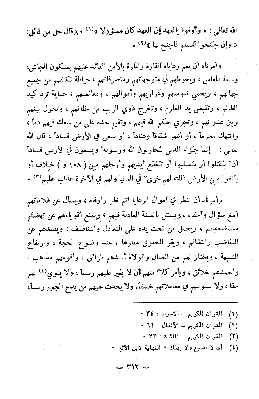 الله تعالى: " وأَوفوا بالعهدِ إِنَّ العهدِ كانَ مسؤولاً ". وقال جل من قائل: " وَإِنْ جَنحوا المسَّلْمِ فاجنحْ لها " وأمرناه أن يعم رعاياة القارة والمارة بالأمن العائد عليهم بسكون الجأش وسعة المعاش ويحوطهم في متوجهاتهم ومتصرفاتهم حياطةً تكنفهم من جميع جهاتهم ويحمي نفوسهم وذراريهم وأموالهم ومعائشهم حمايةً ترد كيد الظالم وتقبض يد الغارم وتخرج ذوي الريب من مظانهم وتحول بينهم وبين عدوانهم وتجري حكم الله فيهم وتقيم حده على من سفك فيهم دماء وانتهك محرماً أو أظهر شقاقاً وعناداً أو سعى في الأرض فساد. قال الله تعالى: " إِنَّما جَزَاءُ الَّذينَ يُحارِبونَ اللهَ وَرَسُولَهُ وَيَسْعُونَ في الأَرضِ فَساداً أَنْ يُقَتَّلوا أَو يُصْلَبُوا أَو يُقطَّعَ أَيديهمْ وأَرجُلُهمْ مِنْ خِلاَفٍ أَو يُنفَوْا مِنَ الأَرضِ ذلكَ لهمْ جِزْيٌ في الدُّنيا ولهم في الآخرةِ عَذَابٌ عظيمٌ " وأمرنا أن ينظر في أموال الرعايا أتم نظر وأوفاه ويسئل عن ظلاماتهم أبلغ سؤال وأحفاه ويستن بالسنة العادلة فيهم ويمنع أقوياهم عن تهضم مستضعفيهم ويحمل من تحت يده على التعادل والتناصف ويصدهم عن التعاصب والتظالم ويقر الحقوق مقارها عند وضوح الحجة وارتفاع الشبهة ويختار لهم من العمال والولاة أسدهم طرائق وأقومهم مذاهب وأحمدهم خلائق ويأمر كلاً منهم أن لا يغير عليهم رسماً ولا ينوي لهم حقاً ولا يسومهم في معاملاتهم خسفاً ولا يحدث عليهم من يدع الجور رسماً
