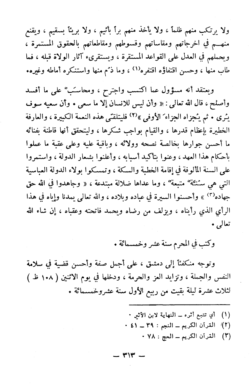 المستقرة ويستقرئ آثار الولاة قبله فما طاب منها وحسن اقتفاؤه اقتفره وما ذم منها واستنكره أماطه وغيره. ويعتقد إنه مسؤول عما اكتسب واجترح ومحاسب على ما أفسد وأصلح. قال الله تعالى: " وأَنْ ليسَ للإِنسانِ إِلاَّ ما سَعَى وأَنْ سَعيهُ سَوفَ يُرَى ثُمَّ يُجزاهُ الجزاءَ الأَوْفَى " فليتلقى هذه النعمة الكبيرة والعارفة الخطيرة بإعظام قدرها والقيام بواجب شكرها وليتحقق إنها قاطنة بفنائه ما أحسن جوارها بخالصة نصحه وولائه وباقية عليه على عقبه ما عملوا بأحكام هذا العهد وغنوا بتأكيد أسبابه وأعلنوا بشعار الدولة واستمروا على السنة المألوفة في إقامة الخطبة والسكة ويمسكوا بولاء الدولة العباسية التي هي سنة متبعة وما عداها ضلالة مبتدعة وجاهدوا في الله حق جهاده وأحسنوا السيرة في عباده وبلاده والله تعالى يمدنا وإياه في هذا الرأي الذي رأيناه ويزلف من رضاه يحمد فاتحته وعقباه إن شاء الله تعالى وكتب في المحرم سنة 510قرة ويستقرئ آثار الولاة قبله فما طاب منها وحسن اقتفاؤه اقتفره وما ذم منها واستنكره أماطه وغيره. ويعتقد إنه مسؤول عما اكتسب واجترح ومحاسب على ما أفسد وأصلح. قال الله تعالى: " وأَنْ ليسَ للإِنسانِ إِلاَّ ما سَعَى وأَنْ سَعيهُ سَوفَ يُرَى ثُمَّ يُجزاهُ الجزاءَ الأَوْفَى " فليتلقى هذه النعمة الكبيرة والعارفة الخطيرة بإعظام قدرها والقيام بواجب شكرها وليتحقق إنها قاطنة بفنائه ما أحسن جوارها بخالصة نصحه وولائه وباقية عليه على عقبه ما عملوا بأحكام هذا العهد وغنوا بتأكيد أسبابه وأعلنوا بشعار الدولة واستمروا على السنة المألوفة في إقامة الخطبة والسكة ويمسكوا بولاء الدولة العباسية التي هي سنة متبعة وما عداها ضلالة مبتدعة وجاهدوا في الله حق جهاده وأحسنوا السيرة في عباده وبلاده والله تعالى يمدنا وإياه في هذا الرأي الذي رأيناه ويزلف من رضاه يحمد فاتحته وعقباه إن شاء الله تعالى وكتب في المحرم سنة 510 وتوجه منكفئاً إلى دمشق على أجمل صفة وأحسن قضية في سلامة النفس والجملة وتزايد العز والحرمة ودخلها في يوم الاثنين لثلاث عشرة ليلة بقيت من ربيع الأول سنة 510