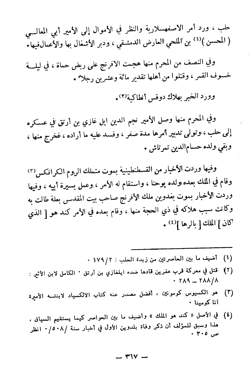 حلب ورد أمر الاصفهسلارية والنظر في الأموال إلى الأمير أبي المعالي المحسن بن الملحمي العارض الدمشقي ودبر الأشغال بها والأعمال فيها. وفي النصف من المحرم منها هجمت الافرنج على ربض حماة في ليلة خسوف القمر وقتلوا من أهلها تقدير مائة وعشرين رجلاً وورد الخبر بهلاك دوقس انطاكية. وفي المحرم منها وصل الأمير نجم الدين ايل غازي بن ارتق في عسكره إلى حلب وتولى تدبير أمرها مدة صفر وفسد عليه ما أراده فخرج منها وبقي ولده حسام الدين تمرتاش. وفيها وردت الأخبار من القسطنطينية بموت متملك الروم الكرانكس وقام في الملك بعده ولده يوحنا واستقام له الأمر وعمل بسيرة أبيه. وفيها وردت الأخبار بمهلك بغدوين ملك الافرنج صاحب بيت المقدس بعلة طالت به وكانت سبب هلاكه في ذي الحجة منها وقام بعده في الأمر كندهو كندهري الملك