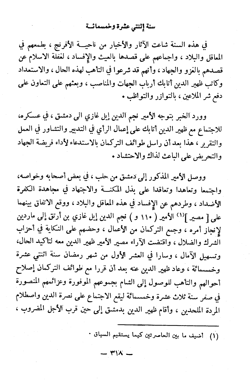 في هذه السنة شاعت الآثار والأخبار من ناحية الافرنج بطمعهم في المعاقل والبلاد وإجماعهم على قصدها بالعيث والافساد لغفلة الاسلام عن قصدهم بالغزو والجهاد وإنهم قد شرعوا في التأهب لهذه الحال والاستعداد وكاتب ظهير الدين أتابك أرباب الجهات والمناصب وبعثهم على التعاون على دفع شر الملاعين بالتوازر والتواظب. وورد الخبر بتوجه الأمير نجم الدين ايل غازي إلى دمشق في عسكره للاجتماع مع ظهير الدين أتابك على أعمال الرأي في التدبير والتشاور في العمل والتقرير هذا بعد أن راسل طوائف التركمان بالاستدعاء لأداء فريضة الجهاد والتحريض على الباعث لذاك والاحتشاد. ووصل الأمير المذكور إلى دمشق من حلب في بعض أصحابه وخواصه واجتمعا وتعاهدا وتعاقدا على بذل المكنة والاجتهاد في مجاهدة الكفرة الأضداد وطردهم عن الافساد في هذه المعاقل والبلاد ووقع الاتفاق بينهما على الأمير نجم الدين ايل غازي بن ارتق والي ماردين لانجاز أمره وجمع التركمان من الأعمال وحضهم على النكاية في اخراب الشرك والضلال واقتضت الآراء مصير الأمير ظهير الدين معه لتأكيد الحال وتسهيل الآمال وسارا في العشر الأول من شهر رمضان سنة 512. وعاد ظهير الدين عنه بعد أن قررا مع طوائف التركمان صلاح أحوالهم والتأهب للوصول إلى الشام بجموعهم الموفورة وعزائمهم المنصورة في صفر سنة 513 ليقع الاجتماع على نصرة الدين واصطلام المردة الملحدين. وأقام ظهير الدين بدمشق إلى حين قرب الأجل المضروب