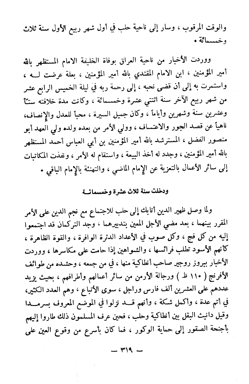 والوقت المرقوب وسار إلى ناحية حلب في أول شهر ربيع الأول سنة 513 ووردت الأخبار من ناحية العراق بوفاة الخليفة الامام المستظهر بالله أمير المؤمنين ابن الامام المقتدي بالله أمير المؤمنين بعلة عرضت له واستمرت به إلى أن قضى نحبه إلى رحمة ربه في ليلة الخميس الرابع عشر من شهر ربيع الآخر سنة 512 وكانت مدة خلافته ستاً وعشرين سنة وشهرين وأياماً وكان جميل السيرة محباً للعدل والانصاف ناهياً عن قصد الجور والاعتساف وولي الأمر من بعده ولده ولي العهد أبو منصور الفضل المسترشد بالله أمير المؤمنين بن أبي العباس أحمد المستظهر بالله أمير المؤمنين وجدد له أخذ البيعة واستقام له الأمر ونفذت المكاتبات إلى سائر الأعمال بالتعزية عن الامام الماضي والتهنئة بالامام الباقي