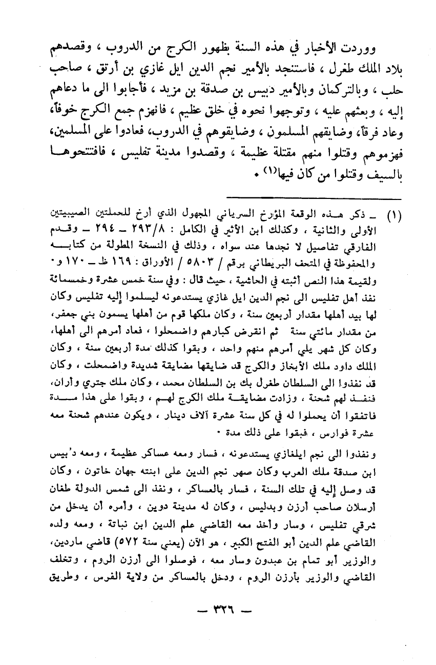 ووردت الأخبار في هذه السنة بظهور الكرج من الدروب وقصدهم بلاد الملك طغرل فاستنجد بالأمير نجم الدين ايل غازي بن ارتق صاحب حلب وبالتركمان وبالأمير دبيس بن صدقة بن مزيد فأجابوا إلى ما دعاهم إليه وبعثهم عليه وتوجهوا نحوه في خلق عظيم فانهزم جمع الكرج خوفاً وعاد فرقاً وضايقهم المسلمون وضايقوهم في الدروب فعادوا على المسلمين فهزموهم وقتلوا منهم مقتلةً عظيمةً وقصدوا مدينة تفليس فافتتحوها بالسيف وقتلوا من كان فيها