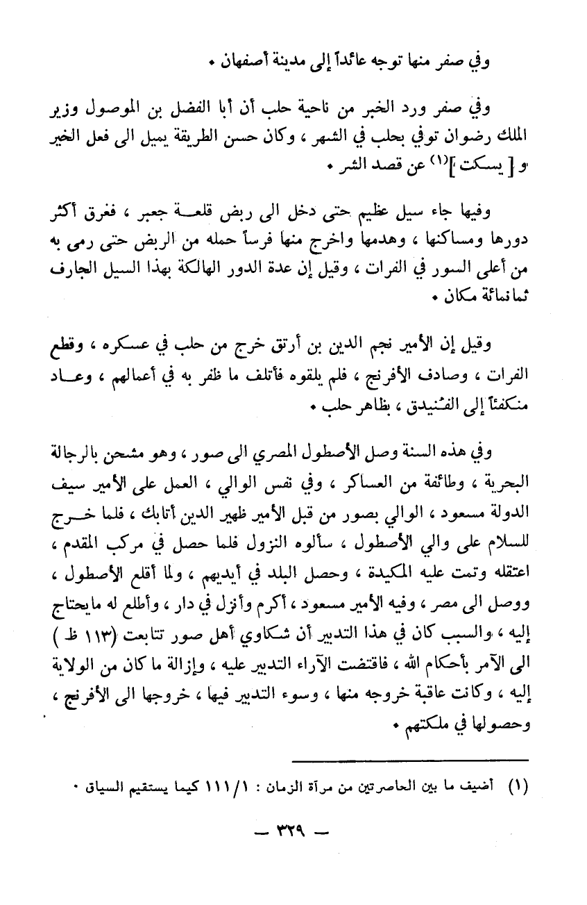 وفي صفر منها توجه عائداً إلى مدينة أصفهان. وفي صفر ورد الخبر من ناحية حلب إن أبا الفضل بن الموصول وزير الملك رضوان توفي بحلب في الشهر وكان حسن الطريقة يميل إلى فعل الخير وعن قصد الشر. وفيها جاء سيل عظيم حتى دخل إلى ربض قلعة جعبر فغرق أكثر دورها ومساكنها وهدمها وأخرج منها فرساً حمله من الربض حتى رمى به من أعلى السور في الفرات وقيل إن عدة الدور الهالكة بهذا السيل الجارف ثمانمائة مكان، وقيل إن الأمير نجم الدين بن ارتق خرج من حلب في عسكره وقطع الفرات وصادف الافرنج فلم يلقوه فأتلف ما ظفر به في أعمالهم وعاد منكفئاً إلى الفنيدق بظاهر حلب وفي هذه السنة وصل الأسطول المصري إلى صور وهو مشحن بالرجالة البحرية وطائفة من العساكر. وفي نفس الوالي العمل على الأمير سيف الدولة مسعود الوالي بصور من قبل الأمير ظهير الدين أتابك. فلما خرج للسلام على والي الأسطول سألوه النزول فلما حصل في مركب المقدم اعتقله وتمت عليه المكيدة وحصل البلد في أيديهم ولما اقلع الأسطول ووصل إلى مصر وفيه الأمير مسعود أكرم وأنزل في دار وأطلع له ما يحتاج إليه. والسبب كان في هذا التدبير إن شكاوي أهل صور تتابعت إلى الآمر بأحكام الله والأفضل بما يعتمده مسعود مع الرعية من الأضرار لهم والمخالفة للعادة والموافقة لهم فاقتضت الآراء التدبير عليه وإزالة ما كان من الولاية إليه وكانت عاقبة خروجه منها وسوء التدبير فيها خروجها إلى الافرنج وحصولها في ملكتهم