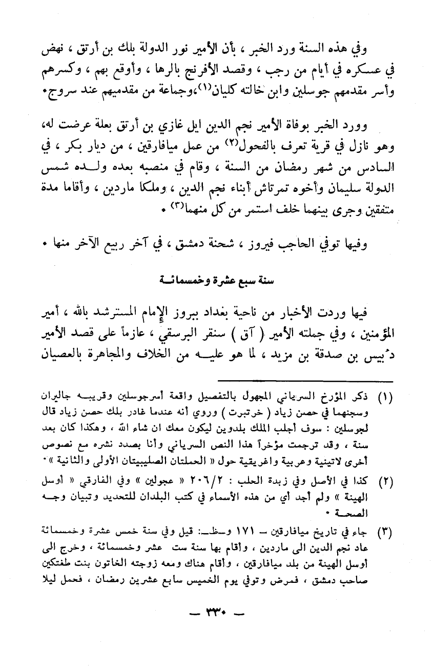 وفي هذه السنة ورد الخبر بأن الأمير نور الدولة يلك بن ارتق نهض في عسكره في أيام من رجب وقصد الافرنج بالرها وأوقع بهم وكسرهم وأسر مقدمهم جوسلين وابن خالته كليان وجماعة من مقدميهم عند سروج. وورد الخبر بوفاة الأمير نجم الدين ايل غازي بن ارتق بعلة عرضت له وهو نازل في قرية تعرف بالفحول من عمل ميافارقين من ديار بكر في السادس من شهر رمضان من السنة وقام في منصبه بعد، ولده شمس الدولة سليمان وأخوه تمرتاش أبناء نجم الدين وملكا ماردين وأقاما مدة متفقين وجرى بينهما خلف استمر من كل منهما. وفيها توفي الحاجب فيروز شحنة دمشق في آخر ربيع الآخر منها