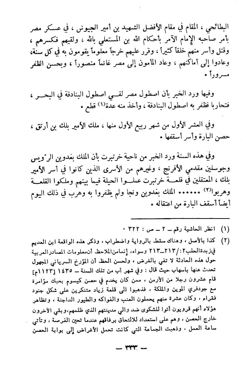 البطائحي المقام في مقام الأفضل الشهيد بن أمير الجيوش في عسكر مصر بأمر صاحبه الامام الآمر بأحكام الله بن المستعلي بالله ولقيهم فكسرهم وقتل وأسر منهم خلقاً كثيراً وقرر عليهم خرجاً معلوماً يقومون به في كل سنة وعادوا إلى أماكنهم وعاد المأمون إلى مصر غانماً منصوراً وبحسن الظفر مسروراً. وفيها ورد الخبر بأن أصطول مصر لقي أصطول البنادقة في البحر فتحاربا فظفر به اصطول البنادقة وأخذ منه عدة قطع. وفي العشر الأول من شهر ربيع الأول منها ملك الأمير بلك بن أرتق حصن البارة وأسر اسقفها وفي هذه السنة ورد الخبر من ناحية خرتبرت بأن الملك بغدوين الرويس وجوسلين مقدمي الافرنج وغيرهم من الأسرى الذين كانوا في أسر الأمير بلك المعتقلين في قلعة خرتبرت عملوا الحيلة فيما بينهم وملكوا القلعة وهربوا...... الملك بغدوين ونجا ولم يظفروا به وهرب في ذلك اليوم أيضاً اسقف البارة من اعتقاله.