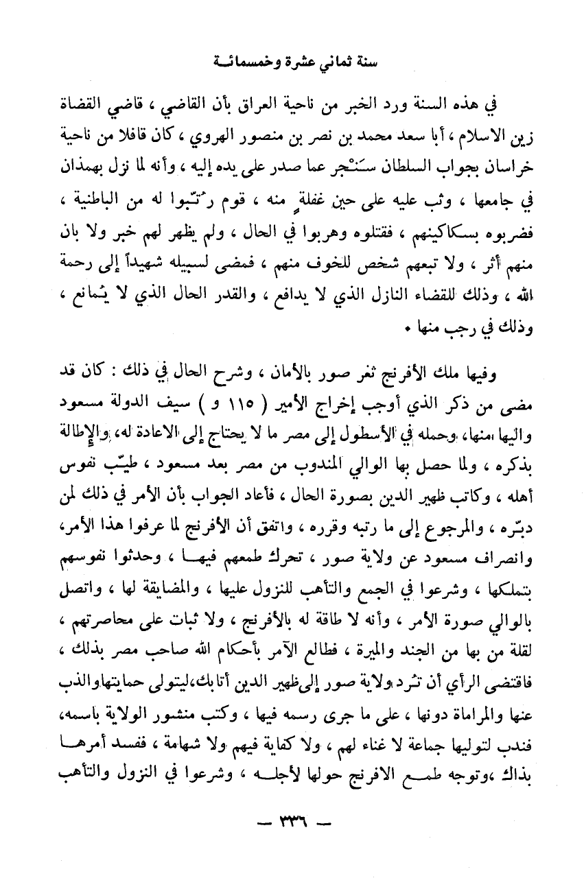 وفيها ملك الافرنج ثغر صور بالأمان وشرح الحال في ذلك كان قد مضى من ذكر الذي أوجب إخراج الأمير سيف الدولة مسعود واليها منها وحمله في الاسطول إلى مصر ما لا يحتاج إلى الاعادة له والاطالة بذكره. ولما حصل بها الوالي المندوب من مصر بعد مسعود طيب نفوس أهله وكاتب ظهير الدين بصورة الحال فأعاد الجواب بأن الأمر في ذلك لمن دبره والمرجوع إلى ما رتبه وقرره. واتفق أن الافرنج لما عرفوا هذا الأمر وانصراف مسعود عن ولاية صور تحرك طمعهم فيها وحدثوا نفوسهم بتملكها وشرعوا في الجمع والتأهب للنزول عليها والمضايقة لها. واتصل بالوالي صورة الأمر وأنه لا طاقة له بالافرنج ولا ثبات على محاصرتهم لقلة من بها من الجند والميرة فطالع الآمر بأحكام الله صاحب مصر بذلك فاقتضى الرأي أن ترد ولاية صور إلى ظهير الدين أتابك ليتولى حمايتها والذب عنها والمراماة دونها على ما جرى رسمه فيها وكتب منشور الولاية باسمه فندب لولايتها جماعةً لا غناء لهم ولا كفاية فيهم ولا شهامة ففسد أمرها بذاك وتوجه طمع الافرنج حوله لأجله وشرعوا في النزول والتأهب