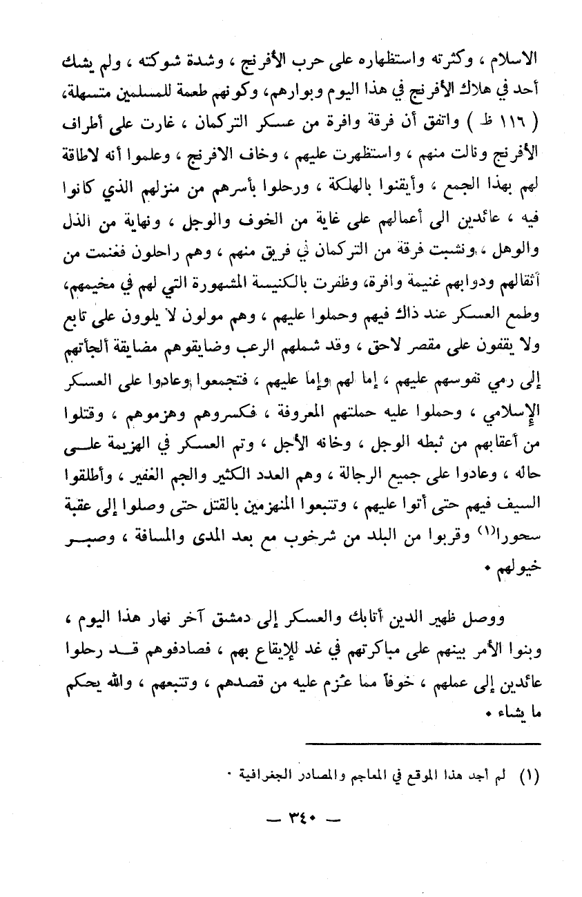 الاسلام وكثرته واستظهاره على حزب الافرنج وشدة شوكته ولم يشك أحد في هلاك الافرنج في هذا اليوم وبوارهم وكونهم طعمةً للمسلمين متسهلة واتفق أن فرقةً وافرةً من عسكر التركمان غارت على أطراف الافرنج ونالت منهم واستظهرت عليهم وخاف الافرنج وعلموا أنه لا طاقة لهم بهذا الجمع وأيقنوا بالهلكة ورحلوا بأسرهم من منزلهم الذي كانوا فيه عائدين إلى أعمالهم على غاية من الخوف والوجل ونهاية من الذل والوهل. ونشب فرقة من التركمان في فريق منهم وهم راحلون فغنمت من أثقالهم ودوابهم غنيمةً وافرةً وظفرت بالكنيسة المشهورة التي لهم في مخيمهم. وطمع العسكر عند ذاك فيهم وحملوا عليهم وهم مولون لا يلوون على تابع ولا يقفون على مقصر لاحق وقد شملهم الرعب وضايقوهم مضايقةً ألجأتهم إلى رمي نفوسهم عليهم أما لهم وأما عليهم فتجمعوا وعادوا على العسكر الاسلامي وحملوا عليه حملتهم المعروفة فكسروهم وهزموهم وقتلوا من أعقابهم من شطبه الوجل وخانه الأجل. وتم العسكر في الهزيمة على حاله وعادوا على جميع الرجالة وهم العدد الكثير والجم الغفير وأطلقوا السيف فيهم حتى أتوا عليهم وتتبعوا المنهزمين بالقتل حتى وصلوا إلى عقبة سحوراً وقربوا من البلد من شرخوب مع بعد المدى والمسافة وصبر خيولهم ووصل ظهير الدين أتابك والعسكر إلى دمشق آخر نهار هذا اليوم وبنوا الأمر بينهم على مباكرتهم في غد للإيقاع بهم فصادفوهم قد رحلوا عائدين إلى عملهم خوفاً مما عز عليه من قصدهم وتتبعهم والله يحكم ما يشاء