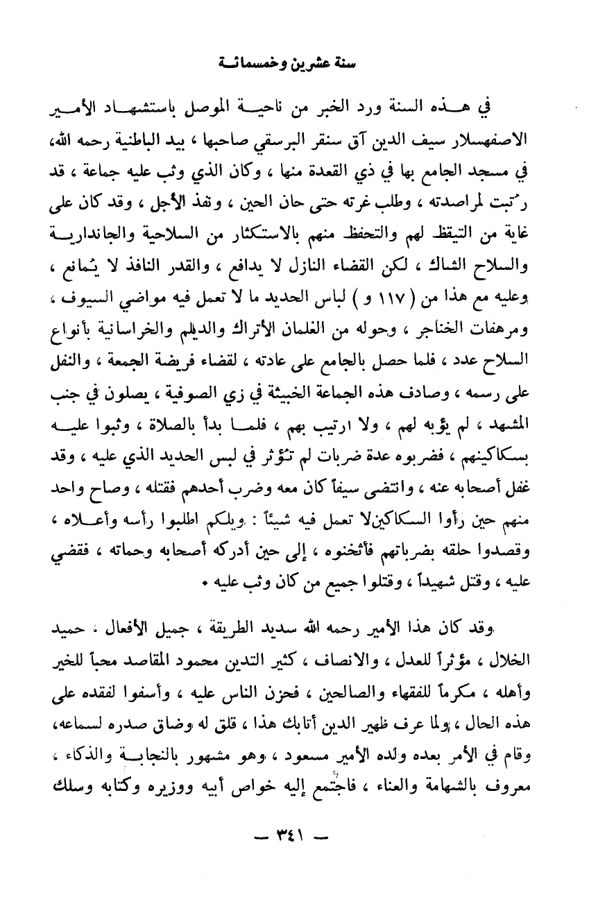 في هذه السنة ورد الخبر من ناحية الموصل باستشهاد الأمير الاصفهسلار سيف الدين اق سنقر البرسقي صاحبها بيد الباطنية رحمه الله في مسجد الجامع بها في ذي القعدة منها وكان الذي وثب عليه جماعة قد رتبت لمراصدته وطلب غرته حتى حان الحين ونفذ الأجل وقد كان على غاية من التيقظ لهم والتحفظ منهم بالاستكثار من السلاحية والحاقدارية والسلاح الشاك لكن القضاء النازل لا يدافع والقدر النافذ لا يمانع وعليه مع هذا من لباس الحديد ما لا تعمل فيه مواضي السيوف ومرهفات الخناجر وحوله من الغلمان الأتراك والديلم والخراسانية بأنواع السلاح عدد. فلما حصل بالجامع على عادته لقضاء فريضة الجمعة والنفل على رسمه وصادف هذه الجماعة الخبيثة في زي الصوفية يصلون في جنب المشهد لم يؤبه لهم ولا ارتيب بهم. فلما بدأ بالصلاة وثبوا عليه بسكاكينهم فضربوه عدة ضربات لم تؤثر في لبس الحديد الذي عليه وقد غفل أصحابه عنه وانتضى سيفاً كان معه وضرب أحدهم فقتله وصاح واحد منهم حين رأوا السكاكين لا تعمل فيه شيئاً: ويلكم اطلبوا رأسه وأعلاه. وقصدوا حلقه بضرباتهم فأثخنوه إلى حين أدركه أصحابه وحماته فقضي عليه وقتل شهيداً وقتلوا جميع من كان وثب عليه. وقد كان هذا الأمير رحمه الله سديد الطريقة جميل الأفعال حميد الأخلاق مؤثر العدل والانصاف كثير التدين محمود المقاصد محباً للخير وأهله مكرماً للفقهاء والصالحين فحزن الناس عليه وأسفوا لفقده على هذه الحال ولما عرف ظهير الدين أتابك هذا قلق له وضاق صدره لسماعه. وقام في الأمر بعده ولده الأمير مسعود وهو مشهور بالنجابة والزكاء معروف بالشهامة والعناء فاجتمع إليه خواص أبيه ووزيره وكتابه وسلك